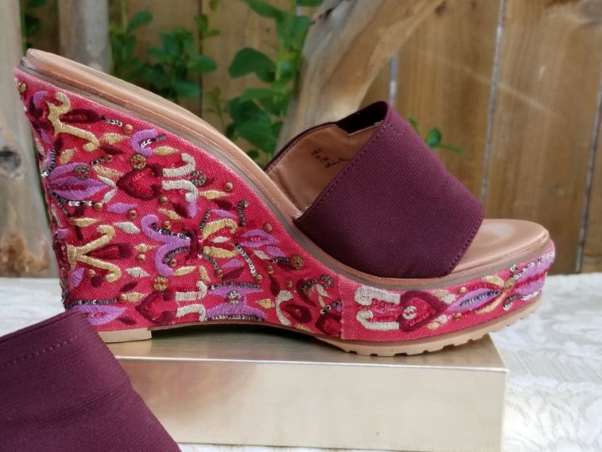 Lisa For Donald J Pliner Women's Kalee Boho wedge Slip On Size 7.5 Pattern: Embroidered/Sequin Heels Heel Height: 4.5 in. and Up Features Sequins/Embroidered patterns. Lovely fuchsia multi color Fabric/Sequins/Elastic Band on Front In Excellent Pre-owned condition. $45 cash firm Pick up in Arlington only if local*** shipping available through the app