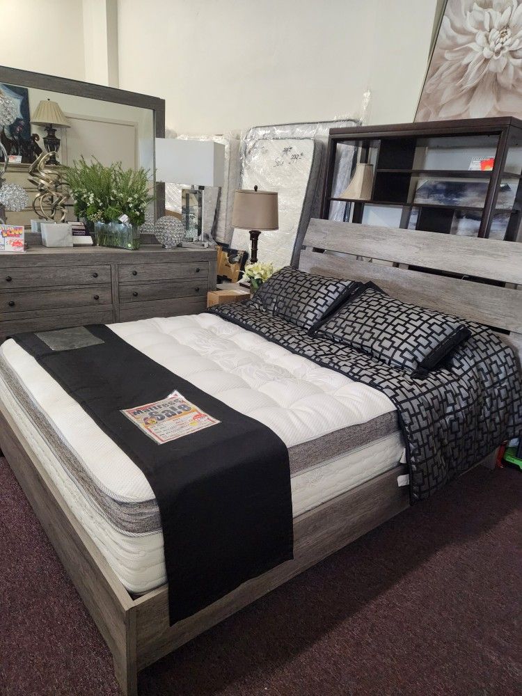Price includes Queen platform bed, dresser, mirror, 1 nightstand Mattress is not included but available for sale Box is not required