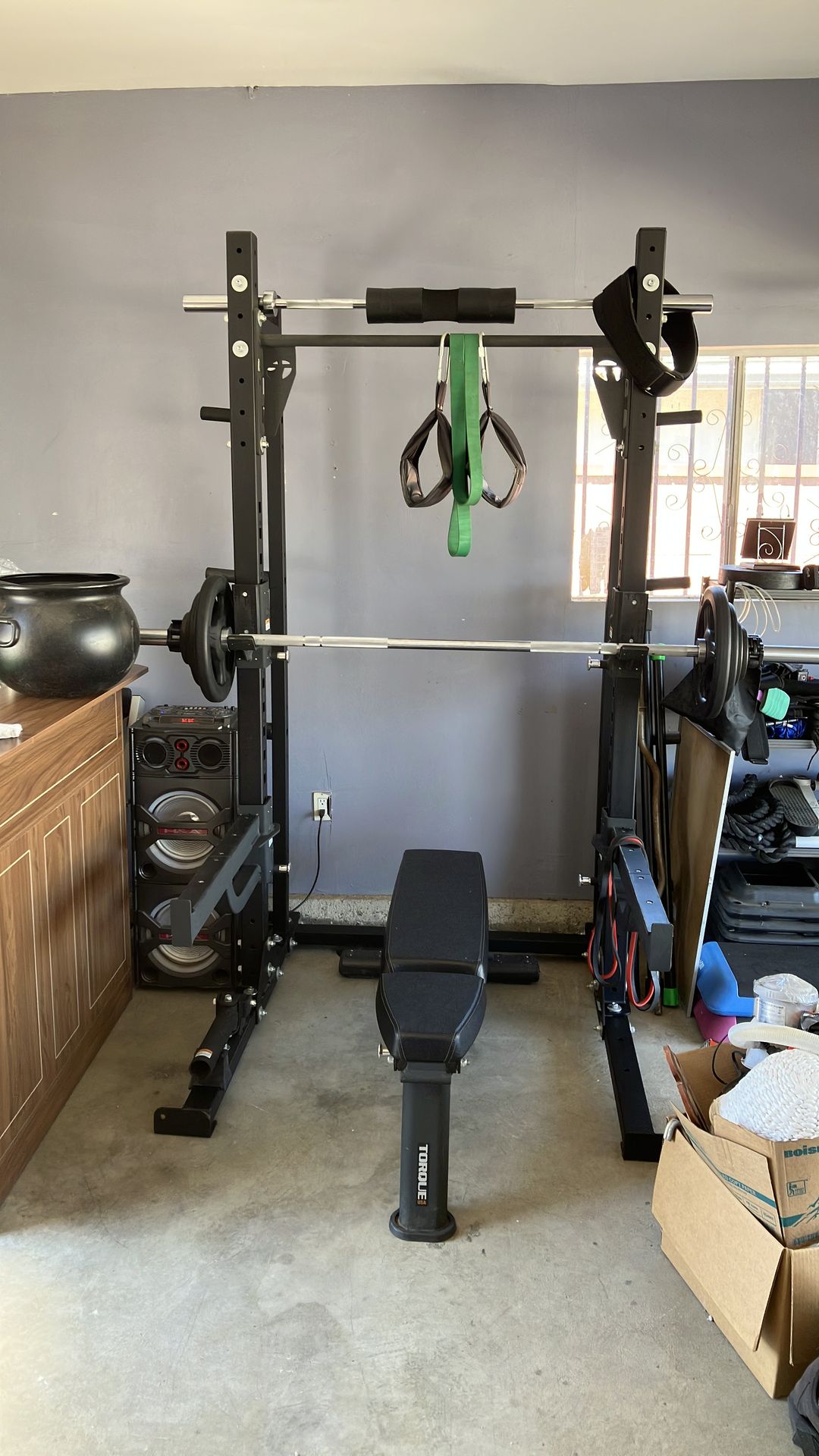 Torque Squat Rack with Torque Barbell and matching Heavy Duty Torque bench and pull up bar Comes with 2x25s 2x10s 2x5s 2x2.5 weights