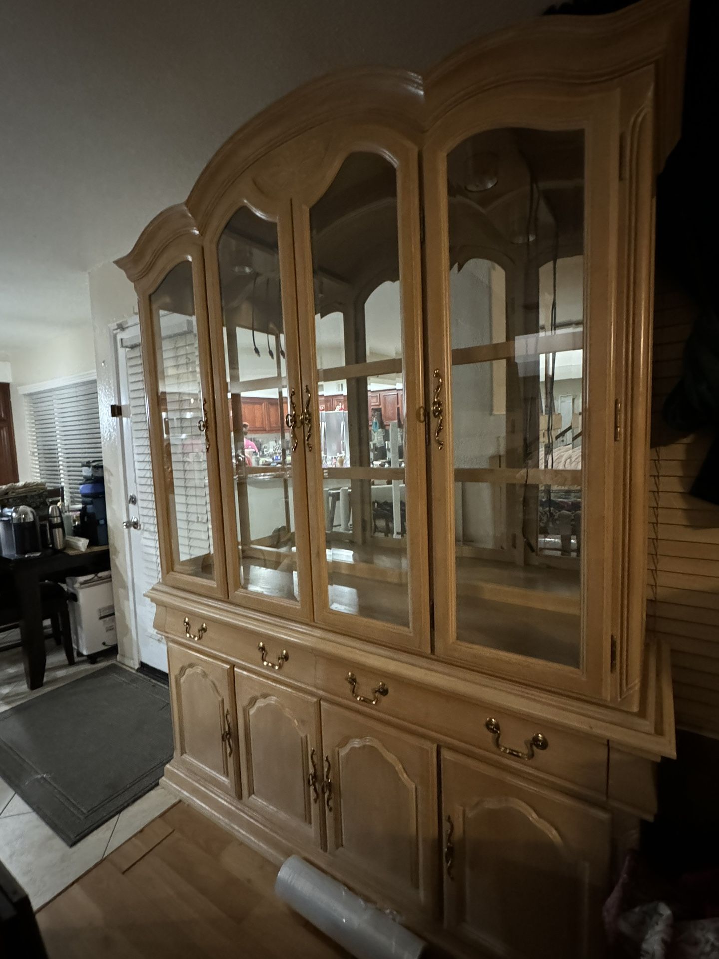 Two piece white wash wood color. Glass shelving lights drawers and cabinets all in working order. One small defect from move. Buyer to pick up. Matching table and chairs available if interested in a set.