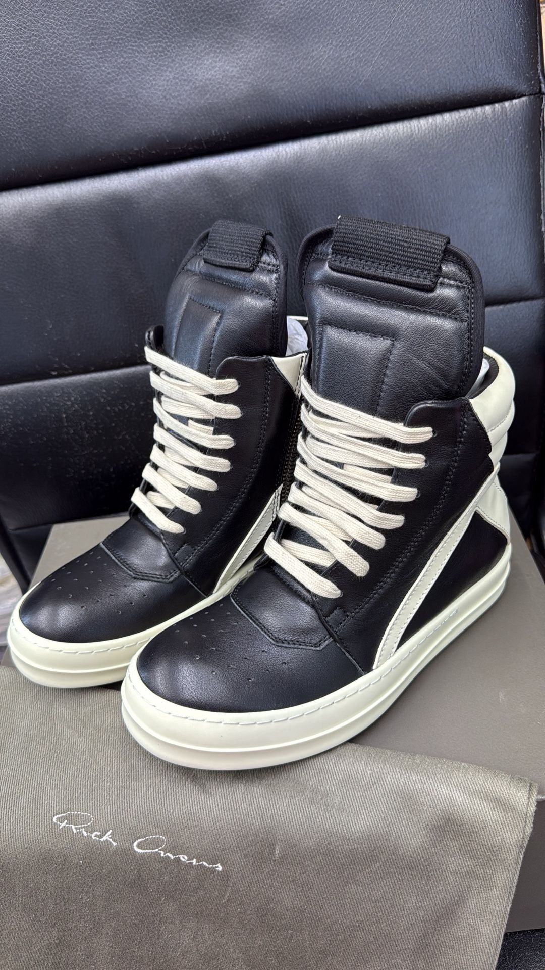 RICK OWENS GEOBASKET SHOES IN BLACK AND MILK-COLORED LEATHER FEATURE LACES, A SIDE ZIPPER FOR EASY FASTENING, A BLACK LEATHER OUTLINE AROUND THE TONGUE AND A WHITE RUBBER SOLE. IT COMES WITH AUTHENTICITY CARD, DUST BAG AND BOX DM me the size you need if you're interested 100% authentic Only meet in a public places