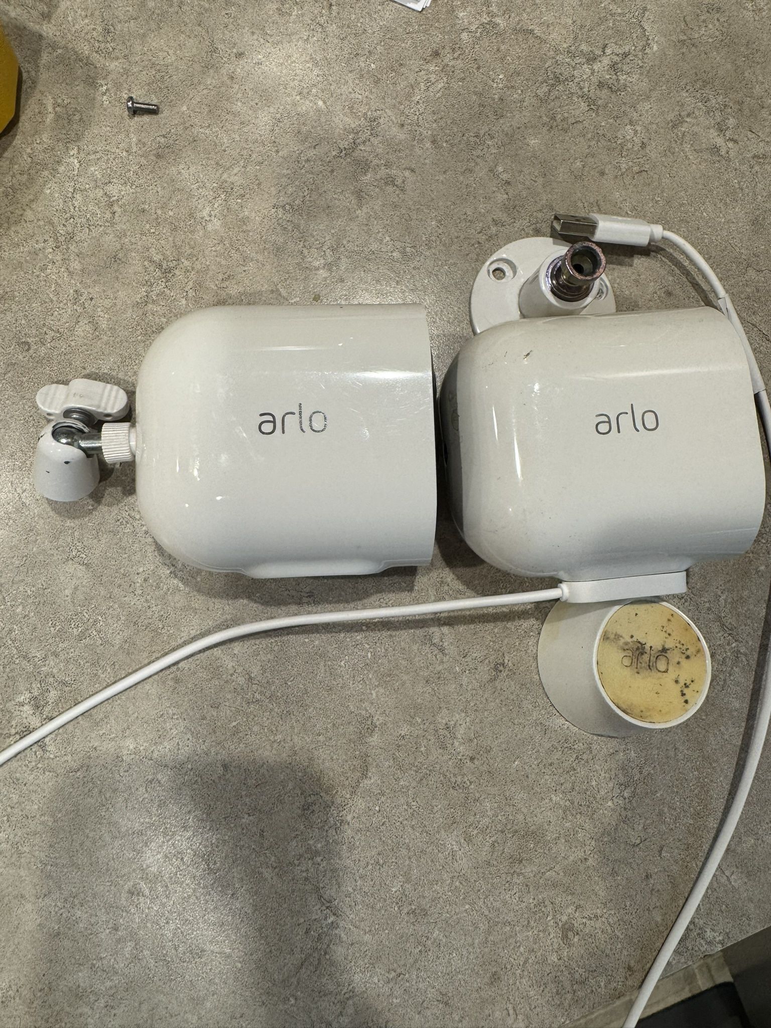 I have two Arlo pro 4s for sale. One with a magnetic mount and another traditional screw mount. The shells have normal wear and tear from being outside, and the mounts have a little paint on them from house work, otherwise they are in perfect condition. Comes with one charging cable.