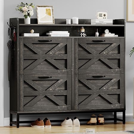 Color Dark Rustic Oak Material Wood Recommended Uses For Product Shoes Product Dimensions 9.45"D x 47.24"W x 43.31"H Special Feature Anti-Tipping, Adjustable Shelf Engineered Wood SR5014 A stylish storage solution: This shoe cabinet strikes the balance between rustic charm and classic elegance, with four flip-down drawers offering plenty of customizable storage for a wide range of boot styles Ample storage space: This cabinet has a generous capacity of up to 24 pairs of shoes, helping to keep your entryway or living room organized and clutter-free. In addition, the open shelves provide versatile display opportunities for ornaments.opportunities for ornaments Stylish Display Choice: Open shelving is a great choice for displaying your favorite accessories and can enhance your home decoration