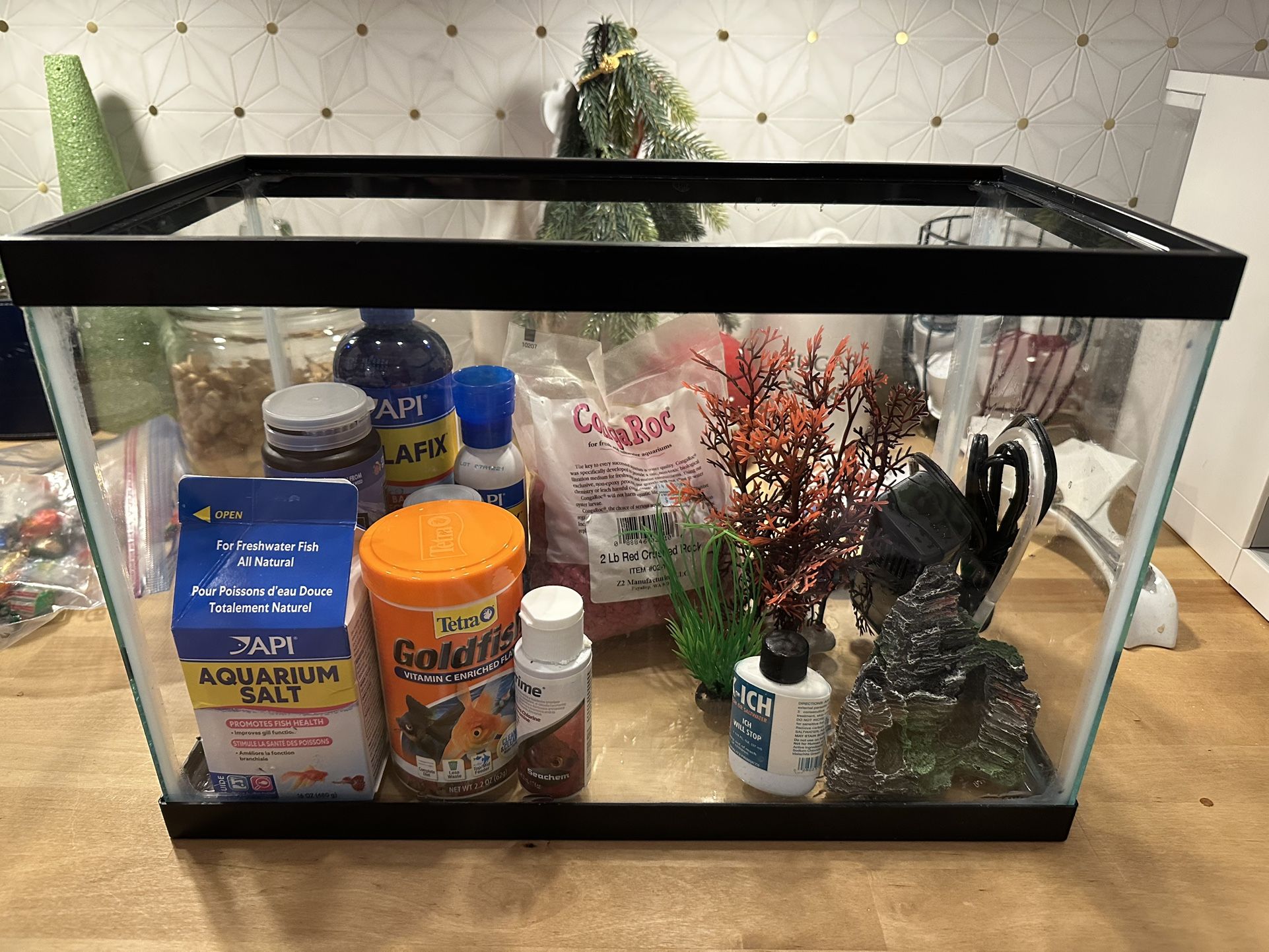 (Almost) everything you need for a goldfish! Everything in tank includes - fish food for several years -ich medicine -aquarium salts -fish bacteria infection medicine - algae stabilizer -chlorine stabilizer -red rocks (not enough to cover the bottom of the tank - recommend getting more) - decorations including fake plants and a rock -tank filter with added aerator