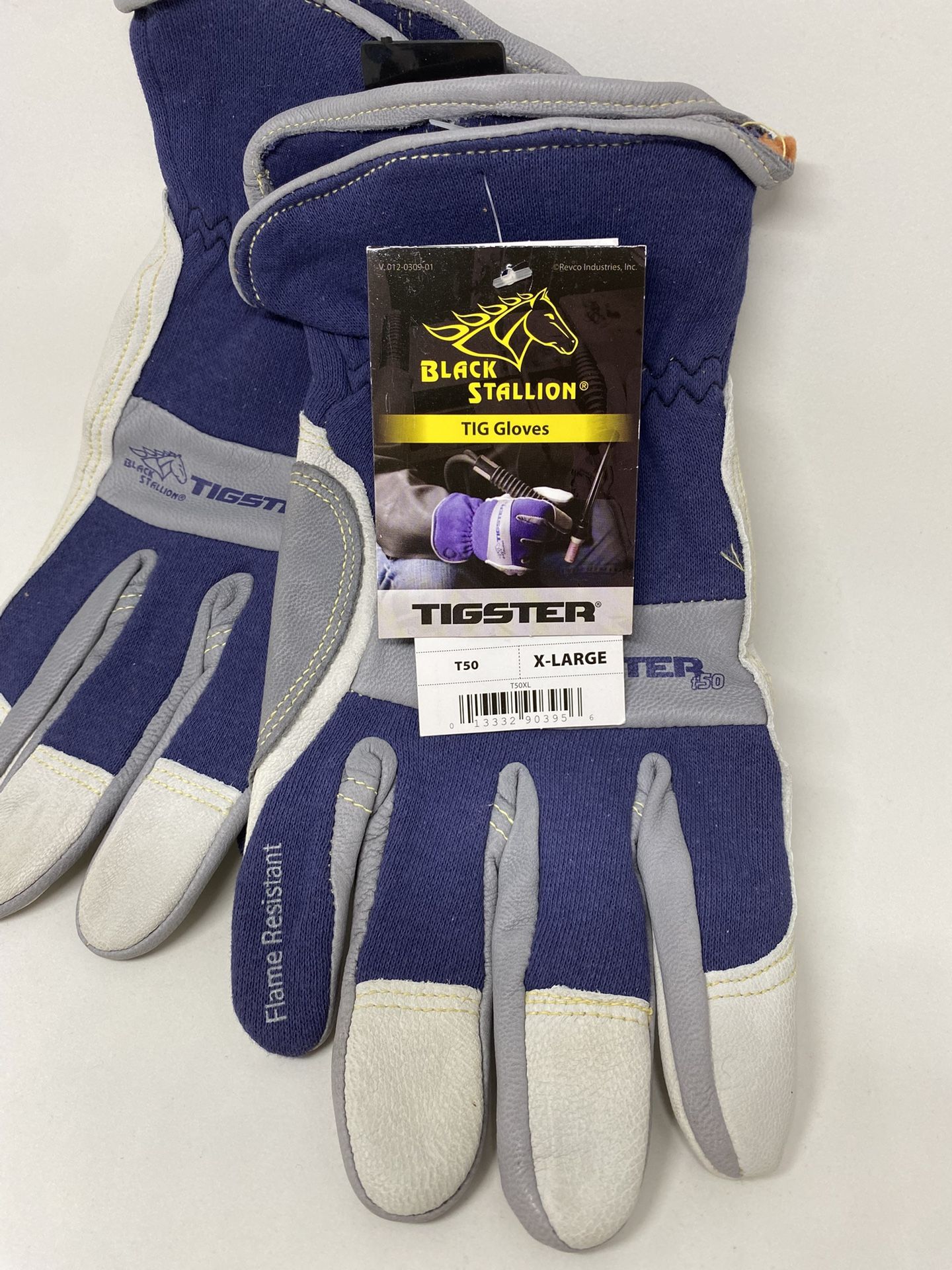 3 brand new pairs of Tigster welding gloves made by Black Stallion. 2 pairs XL with tags and one pair of Large without tags. Gray and blue in color. $20 per pair