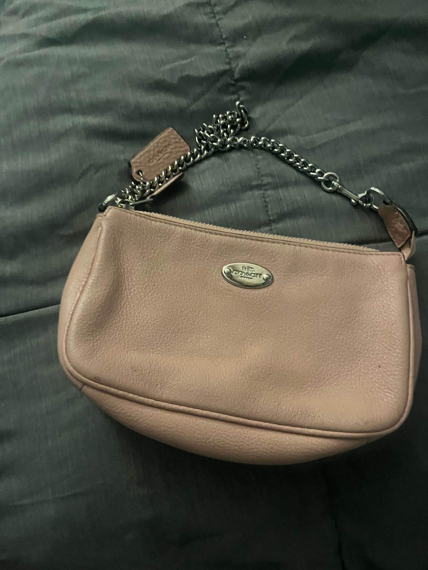 Salmon pink/tan coach purse with a gold chain strap no damage no stains except for a black dot on back of purse (you can see in the photo)