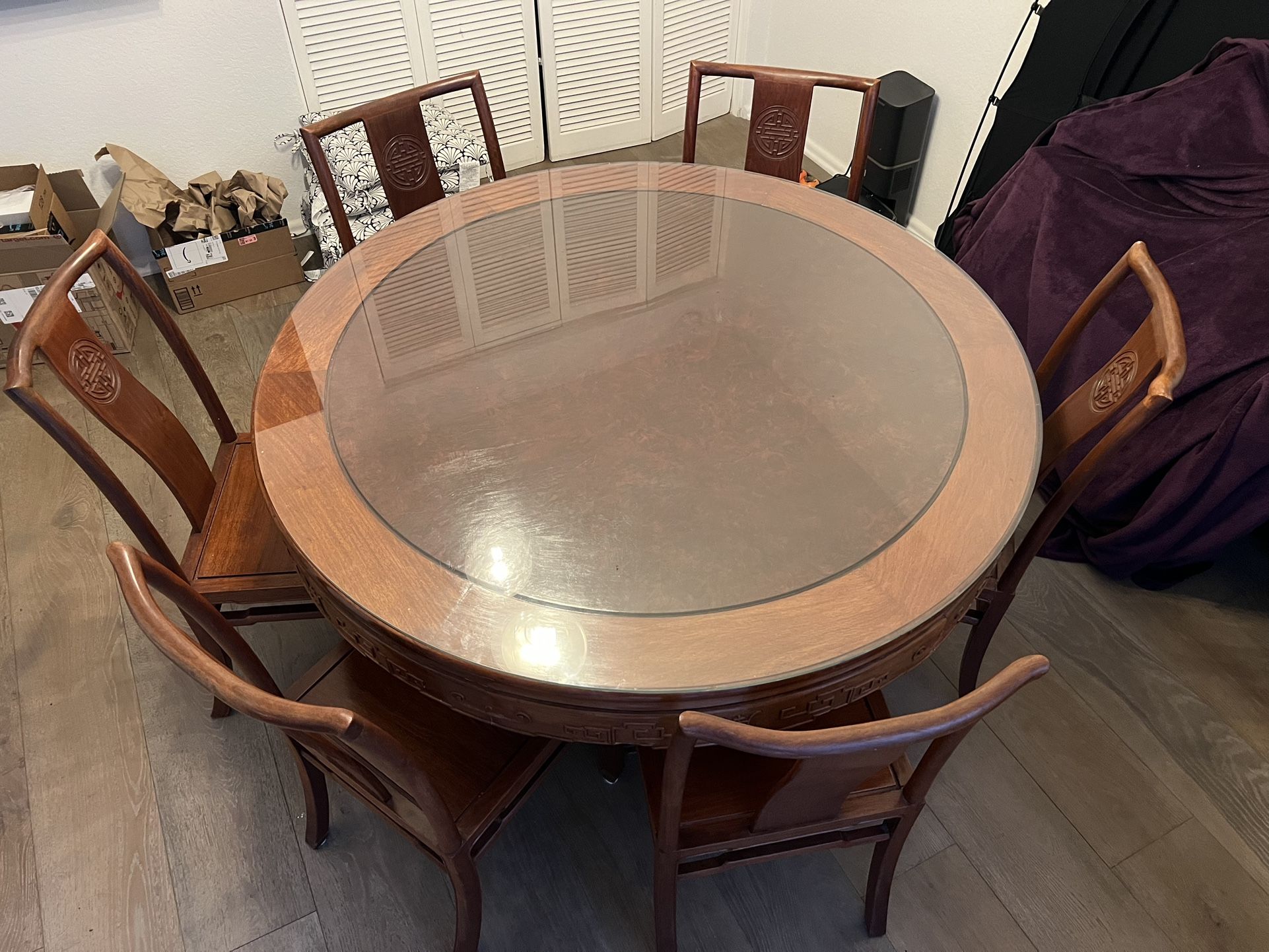 Solid Rosewood table (49 inch diameter) and 6 chairs. Table has a glass top and can be detached from the base. Chairs are in fair to good shape with 3 chairs having been repaired with wood glue at some joints. Local pick up only