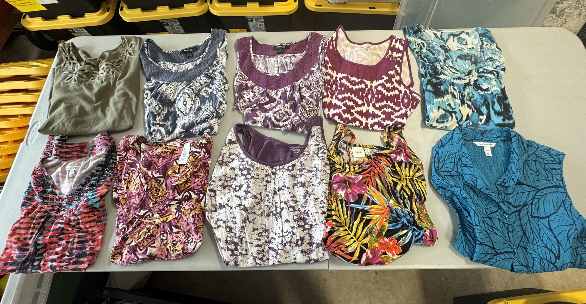 Excellent Condition -$3.50 each -Green Croft&Barrow-Size: Large -Blue/White Style&Co-Size: Large -Purple/White Style&Co-Size: Large -Burgundy Charter Club-Size: Med -Teal/Black/White-Size: Large -Multicolored Fashion Bug-Size: Med -Burgundy/Pink/White/Yellow Liz&Co-Size: Large -Purple/White Coldwater Creek-Size: Large -Multicolored Flower Rafaella Weekend-Size: PMedium -Teal/Black Croft&Barrow-Size: Large