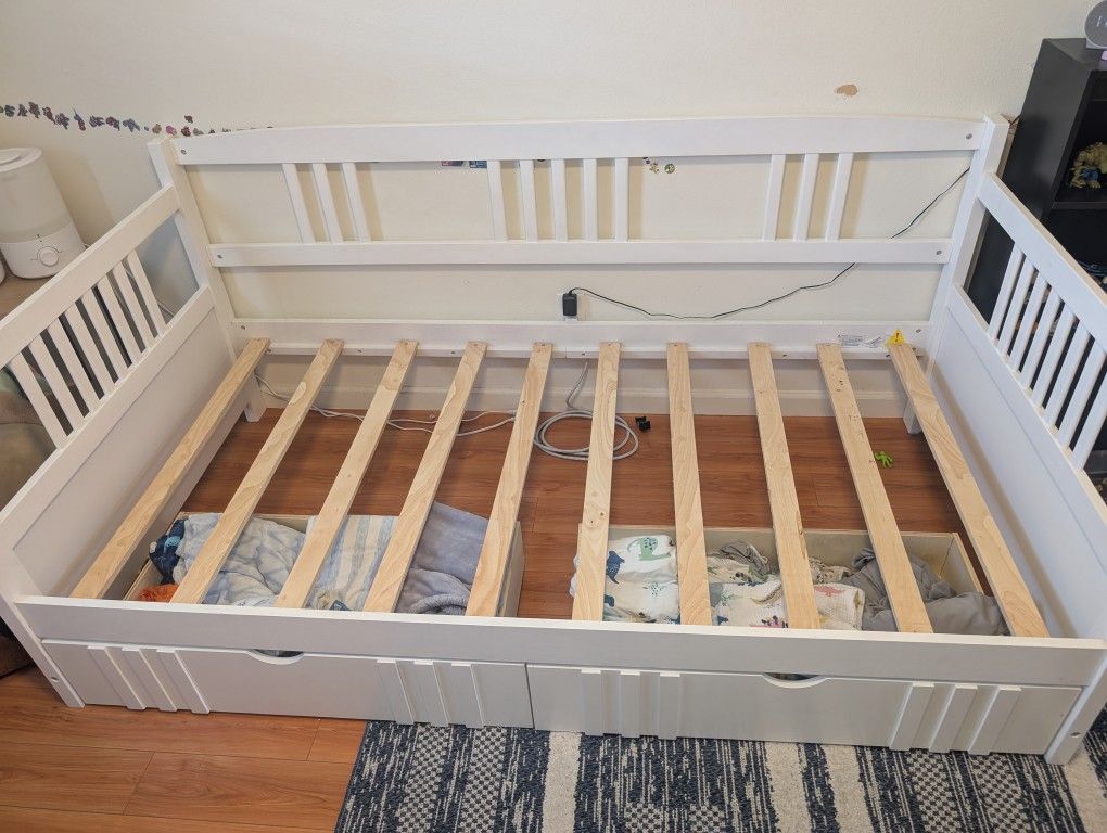 Disassembled . All hardware but no instructions; requires a Phillips head screwdriver and Allen wrench to assemble. Drawers included.