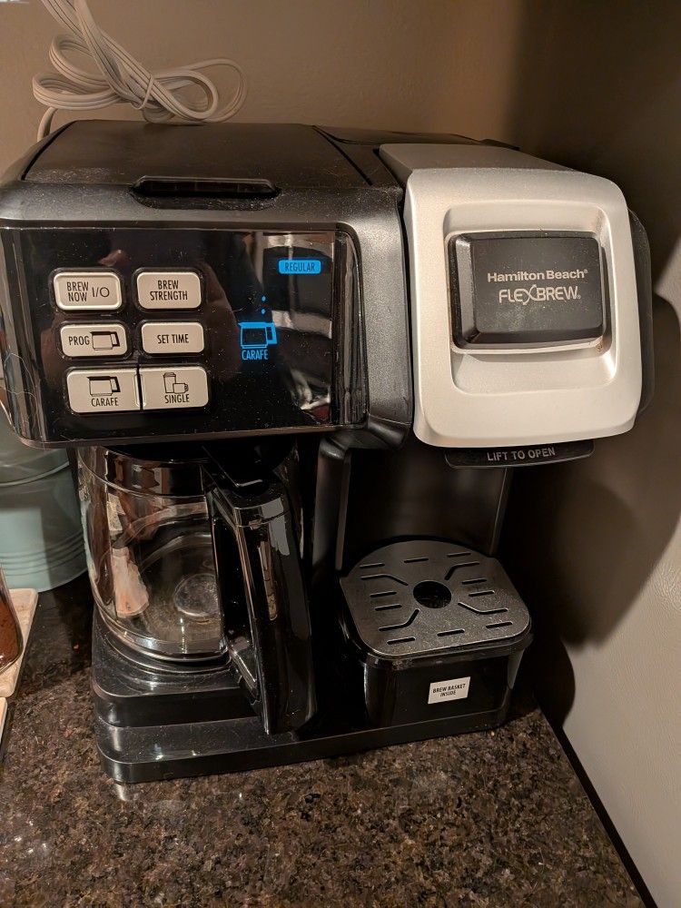 Hamilton beach coffee maker. It has both a coffee pot for ground coffee and a Keurig cup maker. Gently used and in great condition. originally purchased for 100+ from amazon