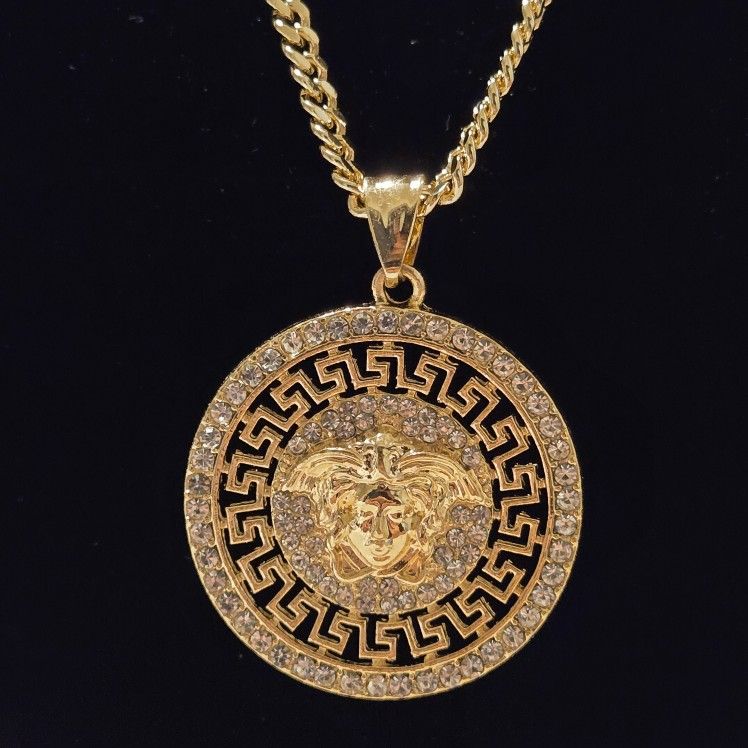 Make a bold statement with this stunning 18K gold-filled Medusa head pendant and chain. Crafted for durabilitv and style this piece is perfect for those who want a luxurious look without the high cost of solid gold. Premium Material: Features a base metal such as brass or alloy) with a high-quality durable 18K gold-filled finish. Iconic Design: The round medallion pendant showcases the classic Medusa head encircled by an intricate Greek key design. Iced Out Bling: Adorned with sparkling cubic zirconia (CZ) stones for an eye-catching, iced-out finish. 20" Cuban Link Chain Pendant Dimensions: 35mm x 38mm