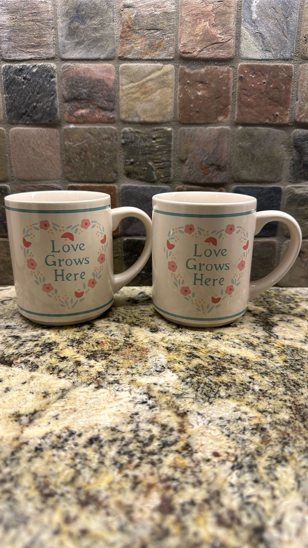 Two vintage coffee mugs(love grows here) Love grows here, compliments by certified INT’L Corporation. Made in Taiwan.