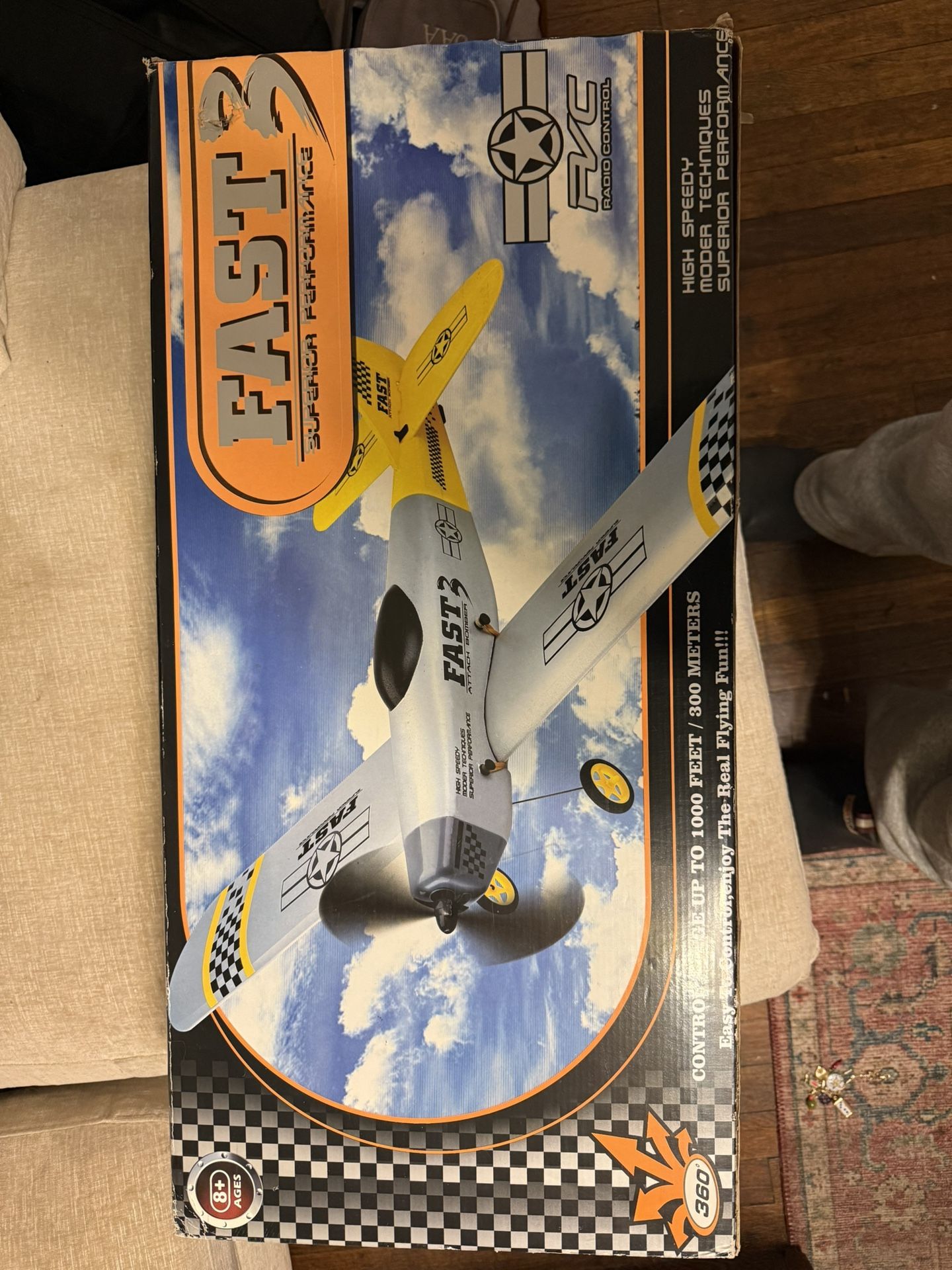 Never used FAST 3 remote control airplane. Never flown, everything still in original packaging inside the box. Ready-to-fly setup and great for beginners or anyone looking to get into RC planes. • 2.4GHz radio control • High speed performance • Up to 1000 ft / 300 meter range • Durable foam body • Ages 8+