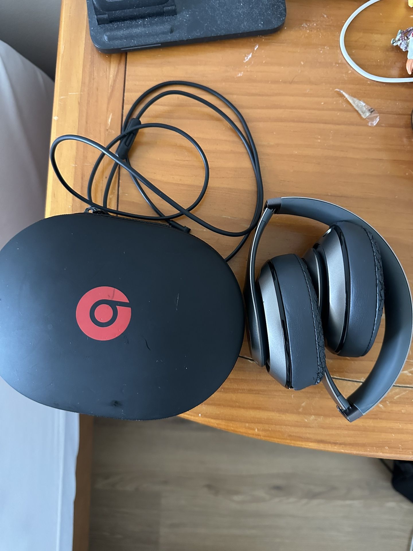 Used – Fully working, but the ear pads are cracked/peeling (see photos). Great for someone who wants a cheap pair of Beats or knows how to replace the cushions Features • Beats Studio wireless over-ear headphones • Bluetooth + wired capable • Includes original Beats carrying case • Folds for easy travel • Great sound + noise isolation • All buttons function normally What’s Wrong • Both ear cushions are worn and cracking • Cosmetic wear from normal use Perfect if you: • Want affordable Beats • Don’t mind replacing the ear pads • Need a backup pair for the gym, work, or study