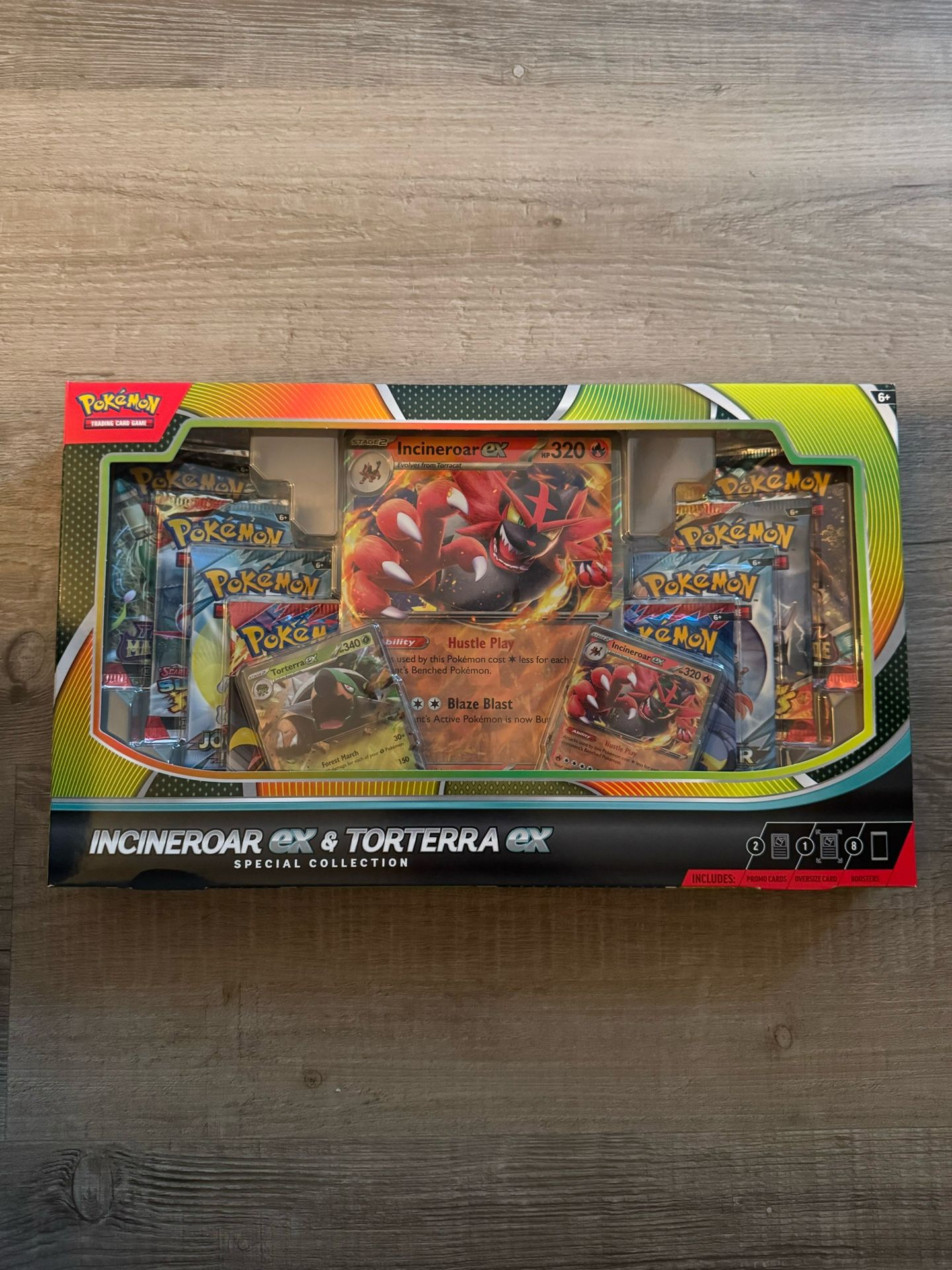 Send your best offer! Unleash raw power and fan-favorite might with the Incineroar ex & Torterra ex Special Collection! This premium Pokémon TCG box features two incredible ex Pokémon—perfect for collectors, competitive players, and anyone looking to boost their sealed collection. Front and center is a large, eye-catching oversized Incineroar ex card, showcasing blazing artwork from the Prismatic Evolutions line. Inside, you’ll also find foil promo cards of Incineroar ex and Torterra ex, each loaded with powerful attacks and striking designs that stand out in any binder or battle deck. To round out the experience, the box includes multiple booster packs, giving you a chance at exciting pulls, rare hits, and new additions to strengthen your collection. Includes: • 2 foil promo cards: Incineroar ex & Torterra ex • 1 oversized Incineroar ex card • Multiple Pokémon TCG booster packs • Premium display packaging—great for collectors or gifting A perfect mix of firepower and durability, this box makes an awesome addition to any Pokémon TCG collection. Grab it while it’s still available!