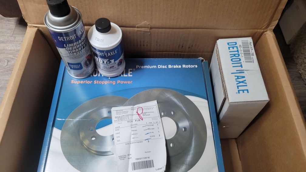 Rear slotted rotors pads, front pads, fluid and brake cleaner.