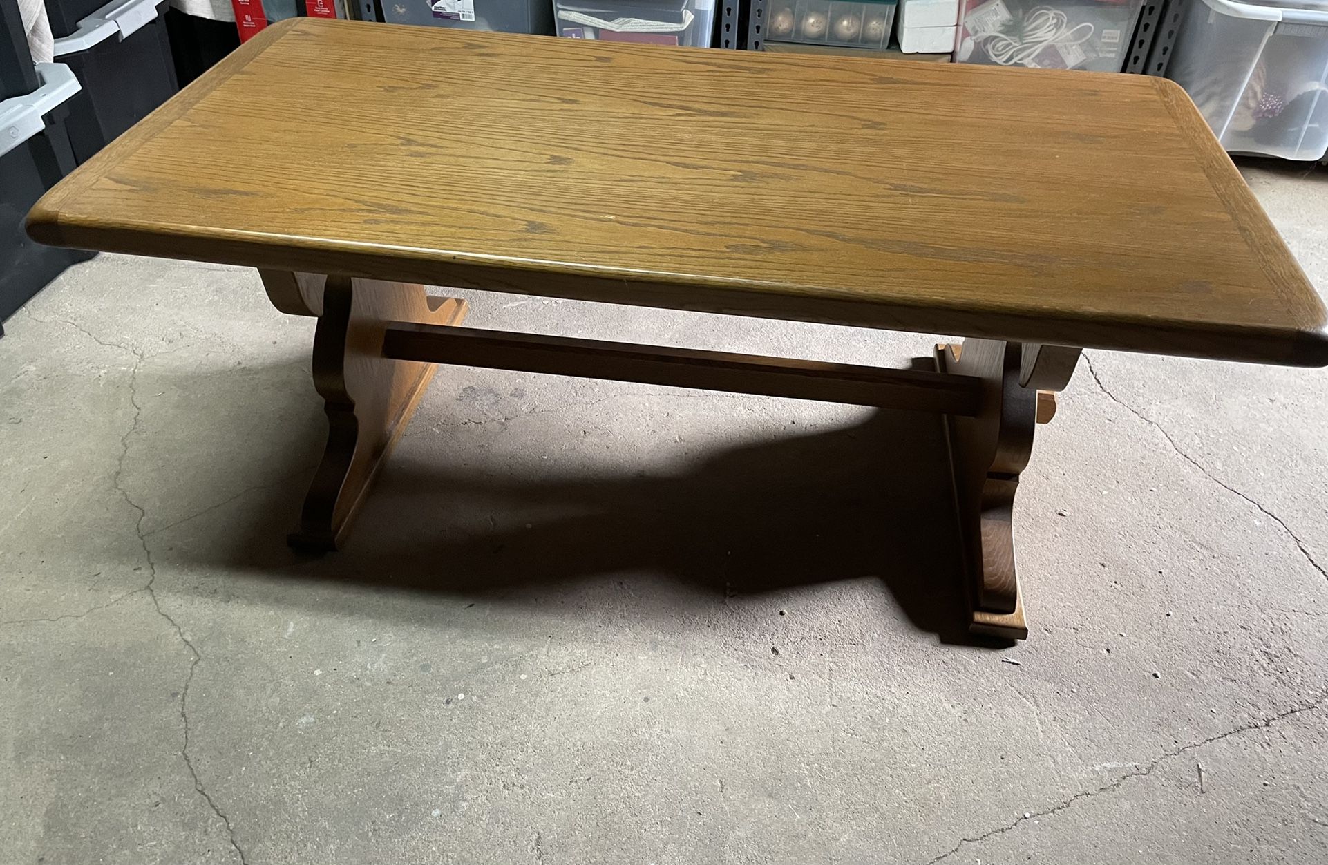 German made coffee table, adjustable height. Dimensions are 56.5” long x 27” wide and can be adjusted from 23” to 26” high Has slight scratches on top