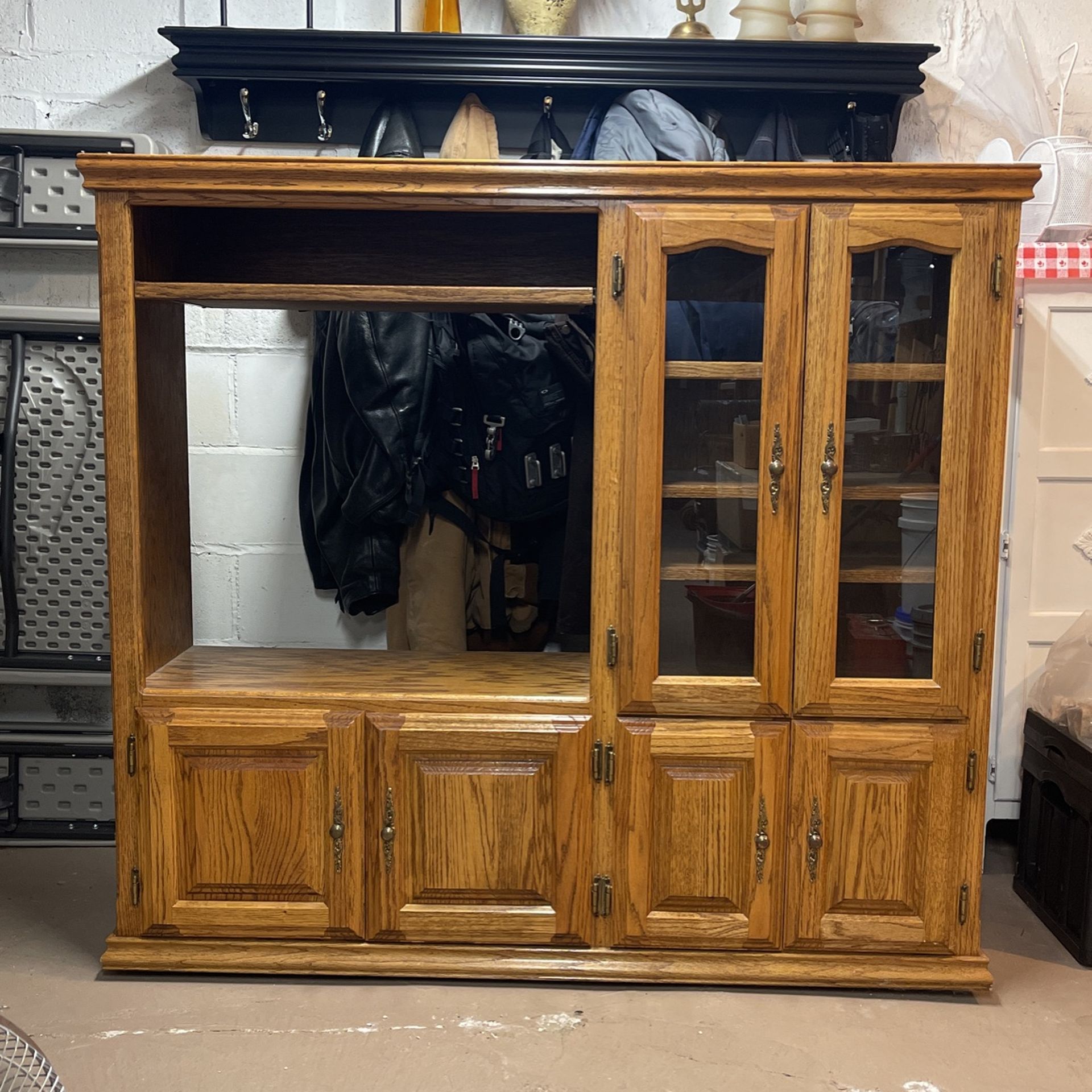 Solid Oak Entertainment Console on castors in very good condition. 50-1/2” Height / 56” Width / 17” Deep Large opening 29-1/4 Width / 24” Height to bottom of slide out shelf
