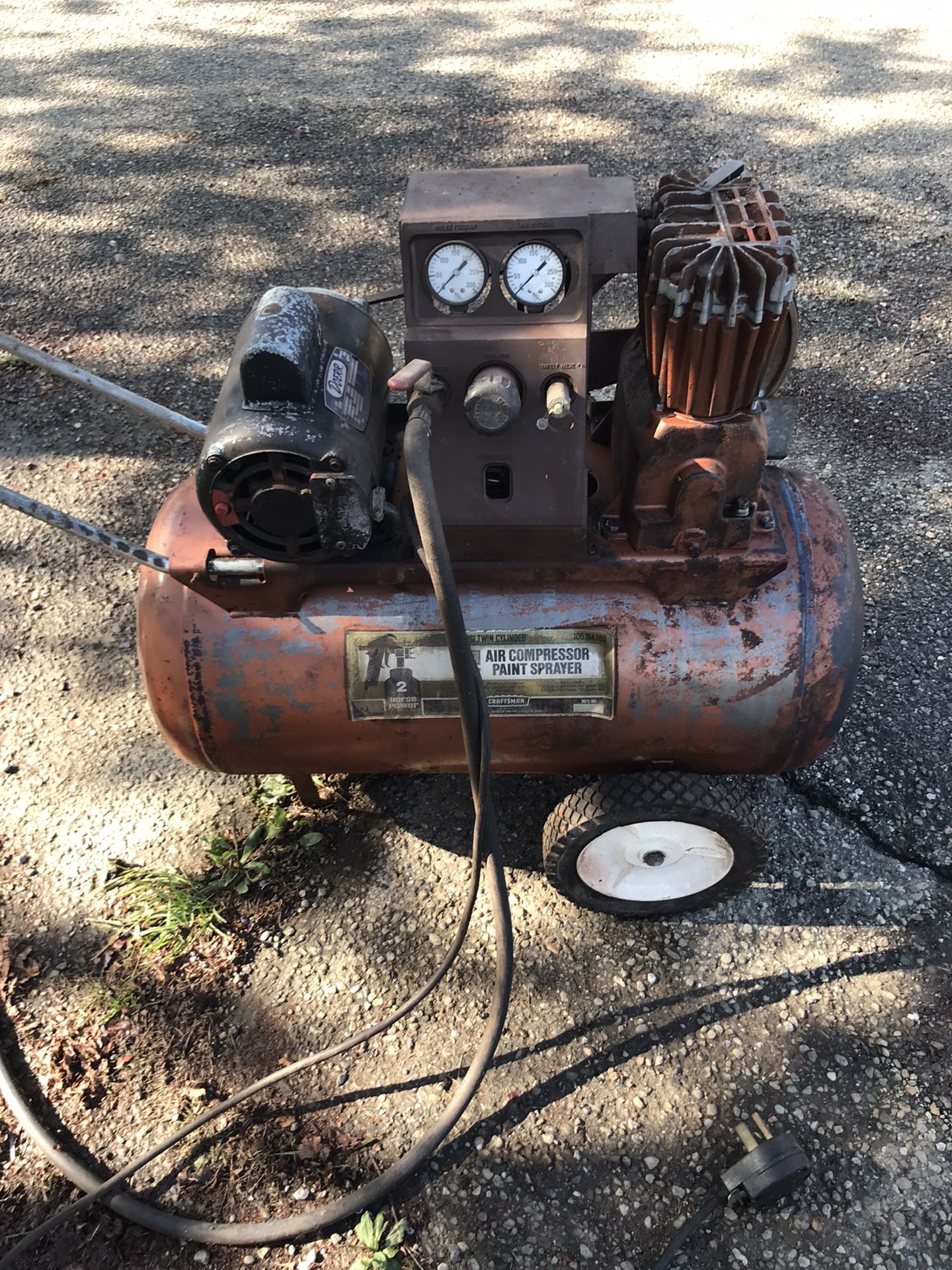 Craftsman air compressor 220 2hp 30 gallon the plug can be changed easily it has a dryer plug on it now. It has roughly 70 ft of hose