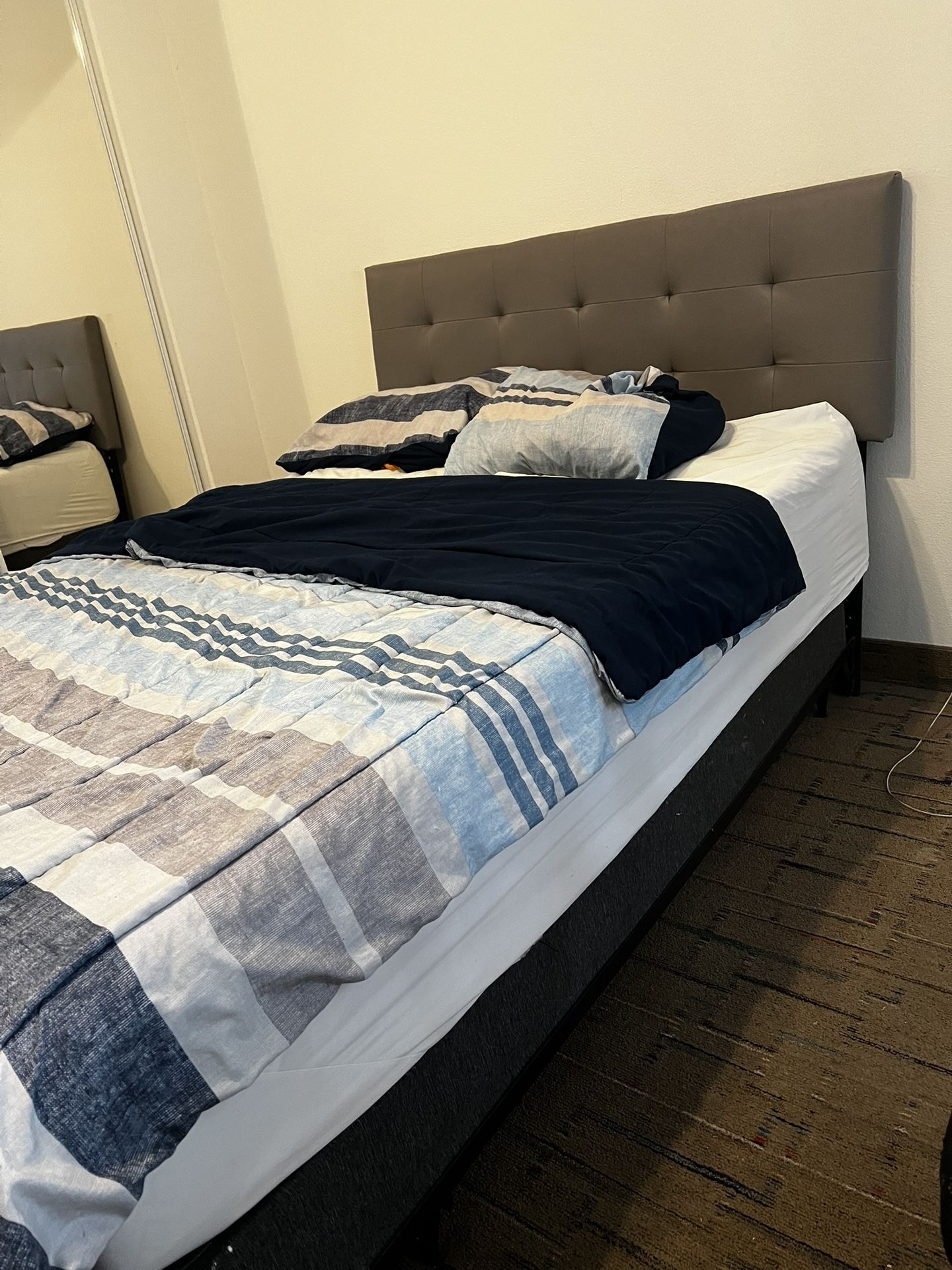 A full size bed with a mattress and a futon Main Street and Civic Center