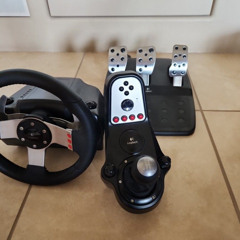 Logitech G27 Steering Wheel with the Stick Shift and 3-Pedals. Works with USB, PC,.Xbox,PS Works and looks great. Motor has less than 50 hours on it.