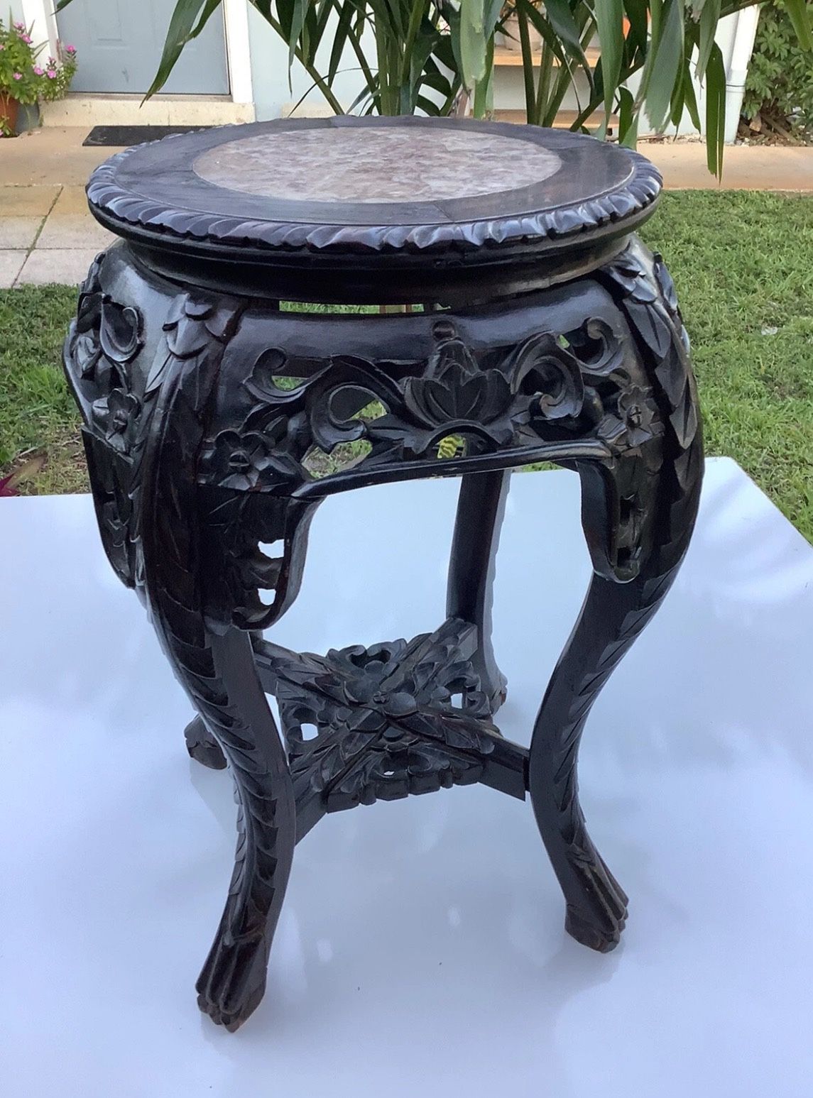 Antique Rosewood Chinese Hand Carved Wood And Marble Plant Stand