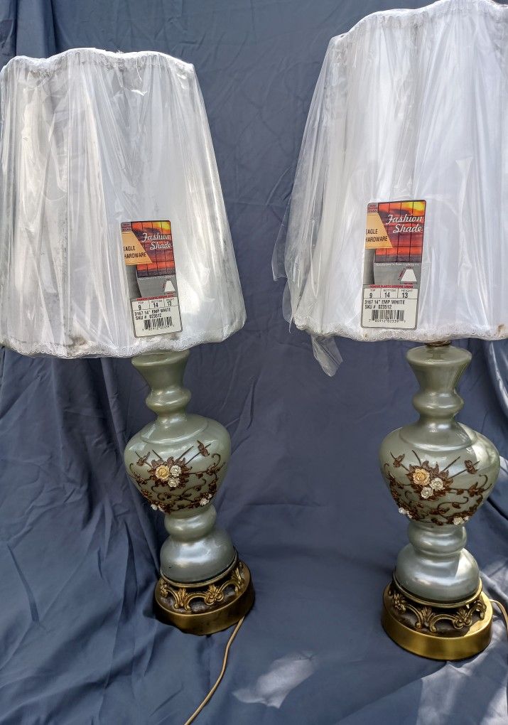A beautiful set of vintage lamps. They are pearlescent pale green and stand about 20 in tall. They have an amazing jeweled design that appears close to perfect.