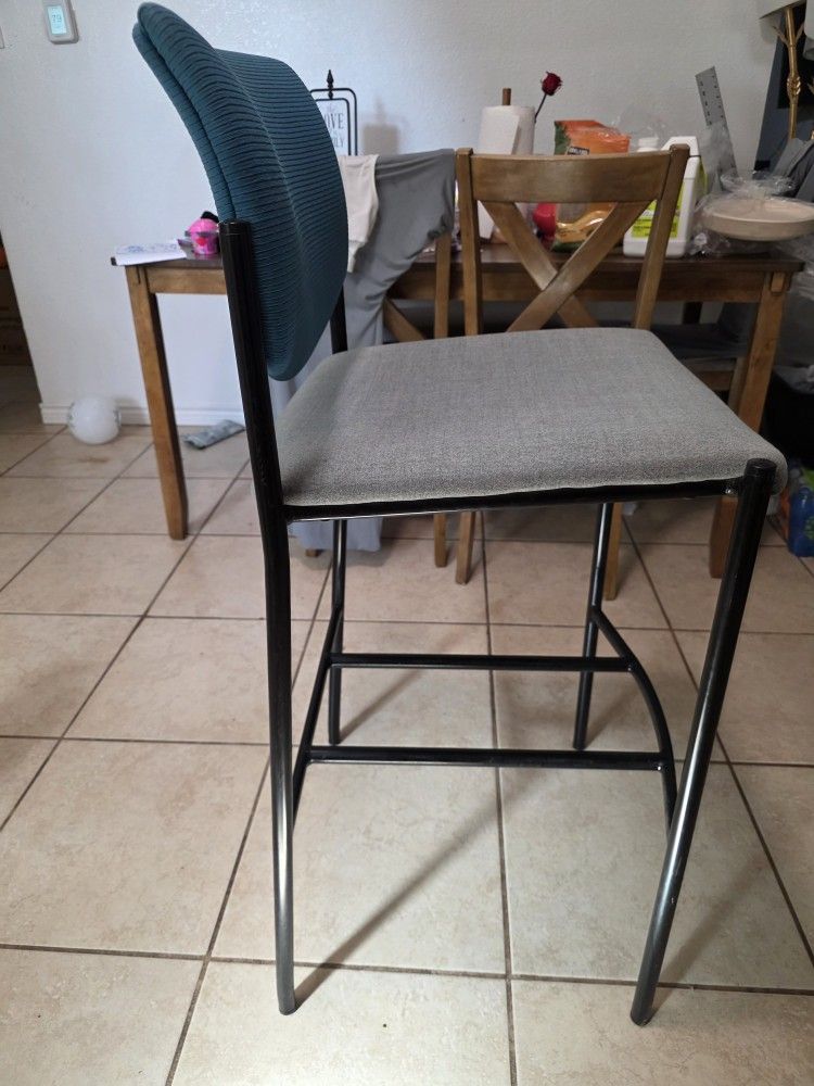 2 Available . $50 Each This is a Steelcase Player Guest Stool. The Player series is known for being a simple, durable, and stackable seating option for a variety of environments, including waiting rooms, classrooms, and cafes. The chair in the image features a black metal frame, a grey upholstered seat, and a blue upholstered backrest.