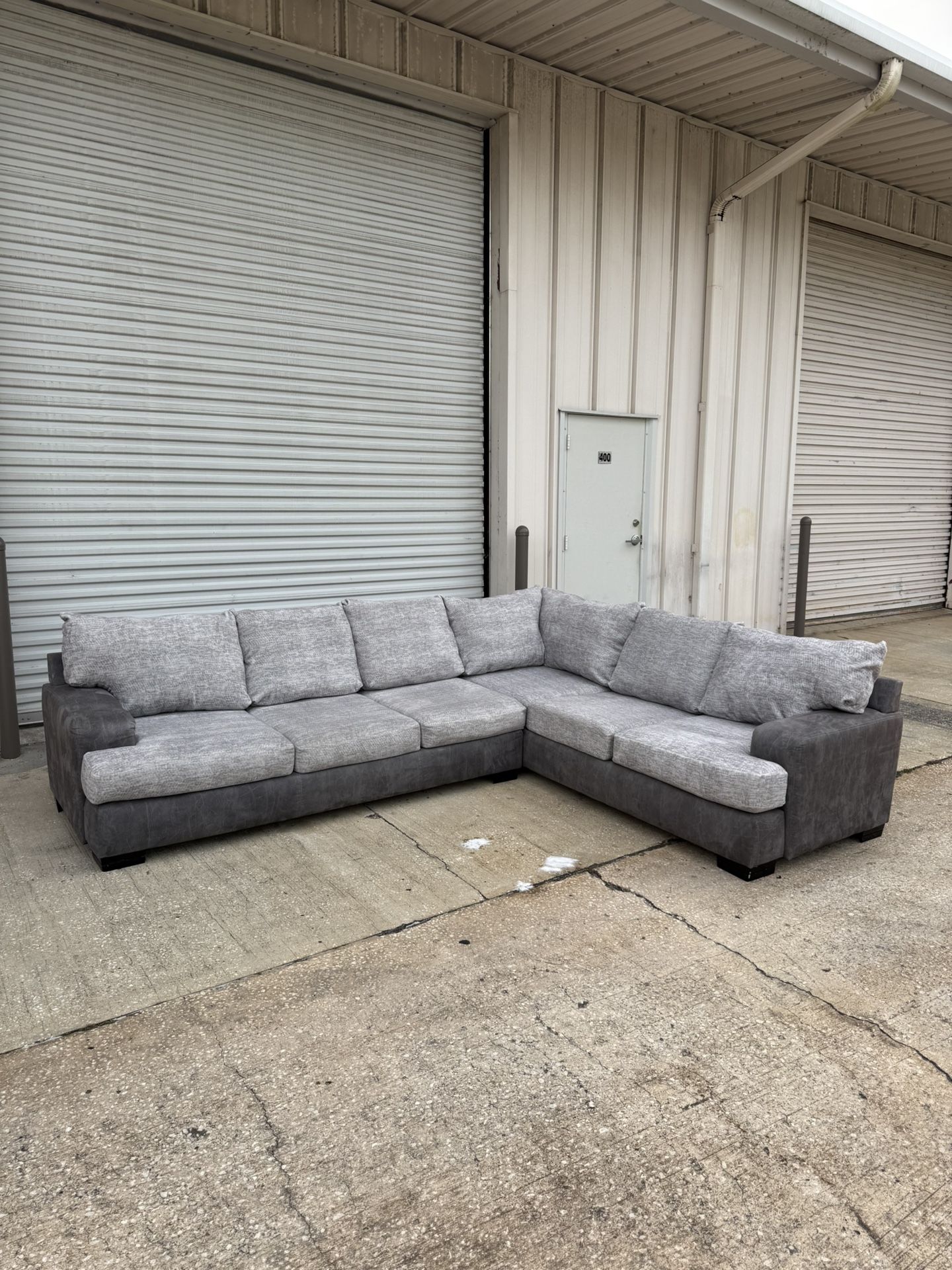 2-tone sectional sofa in great, clean condition. All cushion covers have been washed. No rips. There is a sun stain on the back, but it’s not noticeable if the couch is against a wall. Delivery available 🚚