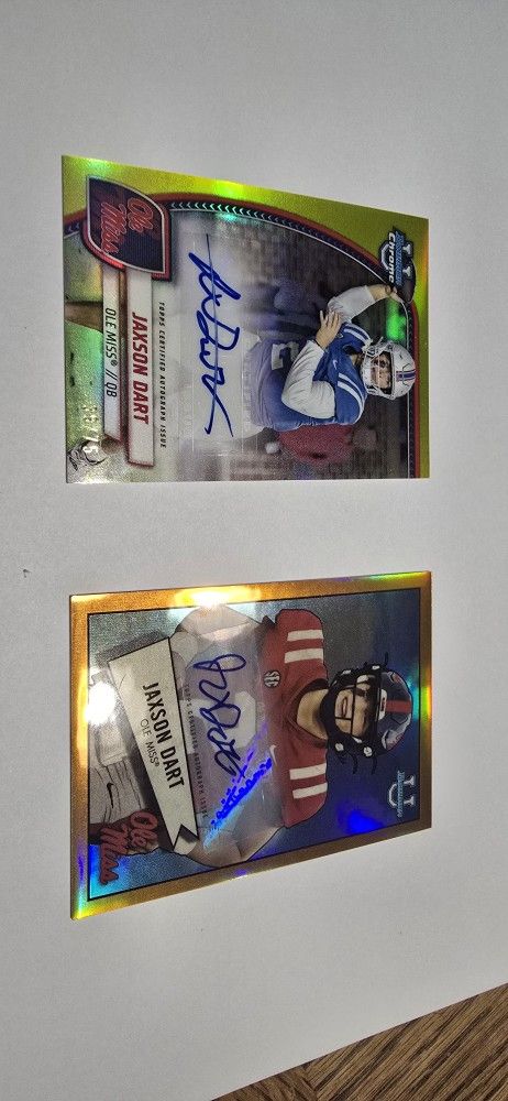 Super rare SSP 1952 topps /25 jaxson dart auto super rare, so rare wont find any on ebay. grading it will likely be a 10, all cards in mint condition highly gradeable. /75 gold jaxson dart auto Gold shimmer sp Rare full Numbered rainbow set 4/5 1/10 10/15 12/25 12/35 2/50 jersey numbered 30/75 9/99 51/100 65/125 60/149 67/125 Great xmas gift start your collection with a huge boost.