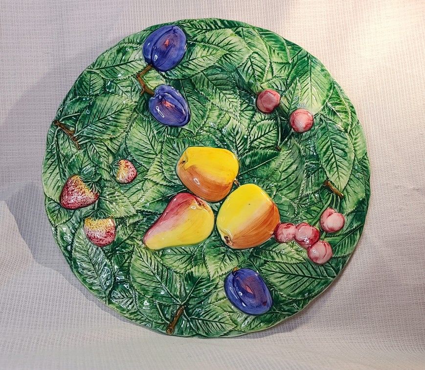 Majolica 12.75" Platter Made in Italy Handpainted Embossed Green Leaves & Assorted Fruit including: Pear Apples Cherries Plums, and Strawberries Stamp 10428/32 Similar to Neiman Marcus Plates & Bowls from the 1980s. Please review all of the photos. There are minor paint chips on this item.