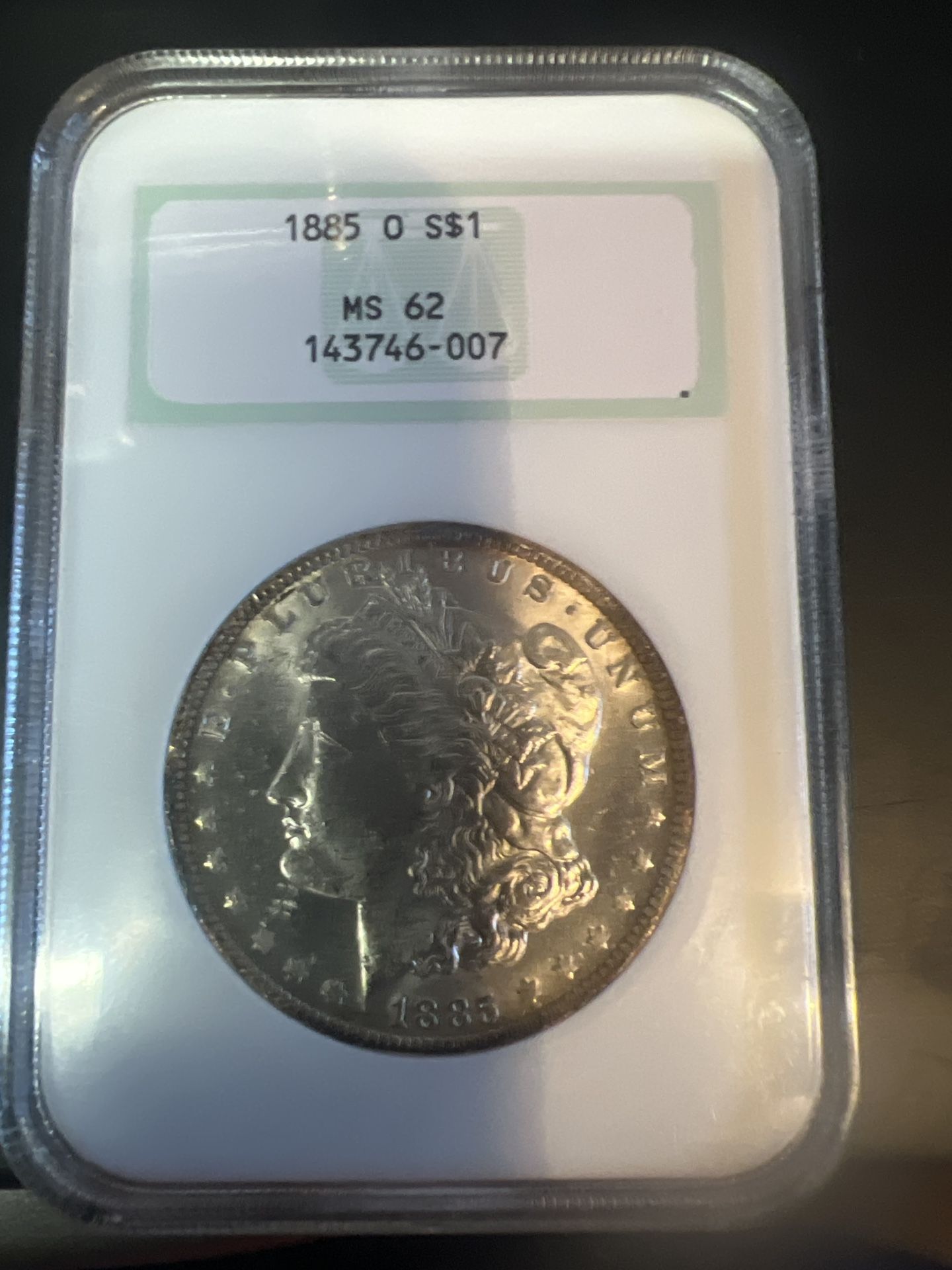 🪙 Coin Information • Type: Morgan Silver Dollar • Date: 1885 • Mint Mark: O (New Orleans) • Grade: MS62, certified by NGC • Certification #: 143746-007 (older NGC generation “fatty” slab) ⸻ 🧾 Description The 1885-O Morgan Dollar is known for its high mintage and strong strike. Most coins from the New Orleans Mint in 1885 were well-struck and stored for decades before release, resulting in many Mint State survivors. Your MS62 example shows: • Moderate bag marks (especially in the fields and cheek area) • Above-average luster • Strong detail on Liberty’s hair and the eagle’s breast feathers A solid mid-grade Mint State coin. ⸻ 💰 Current Raw eBay Sales (as of July 2025) Recent raw (uncertified) 1885-O Morgan Dollar sales in MS60–MS63 condition: Grade Raw Sale Price Range MS60–MS61 $75–$90 MS62 $90–$110 MS63 $110–$135