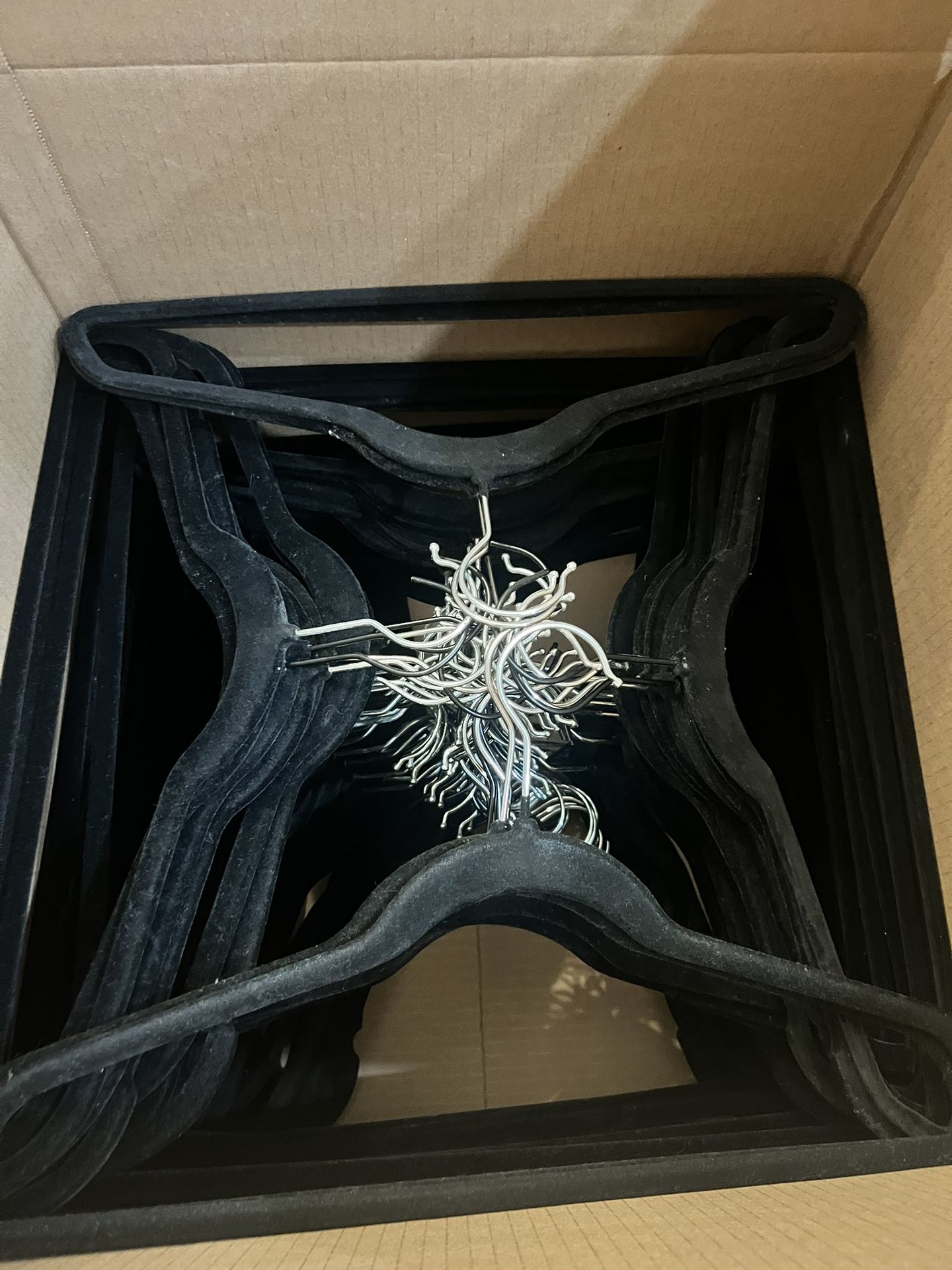 Box full of black velvet hangers. All in great condition although there is a mix. Some have silver tops and some have black. Most have the option to hang pants from them but there are some that can only hang tops. Estimating about 75-100 hangers. Must pick up in Little Italy!