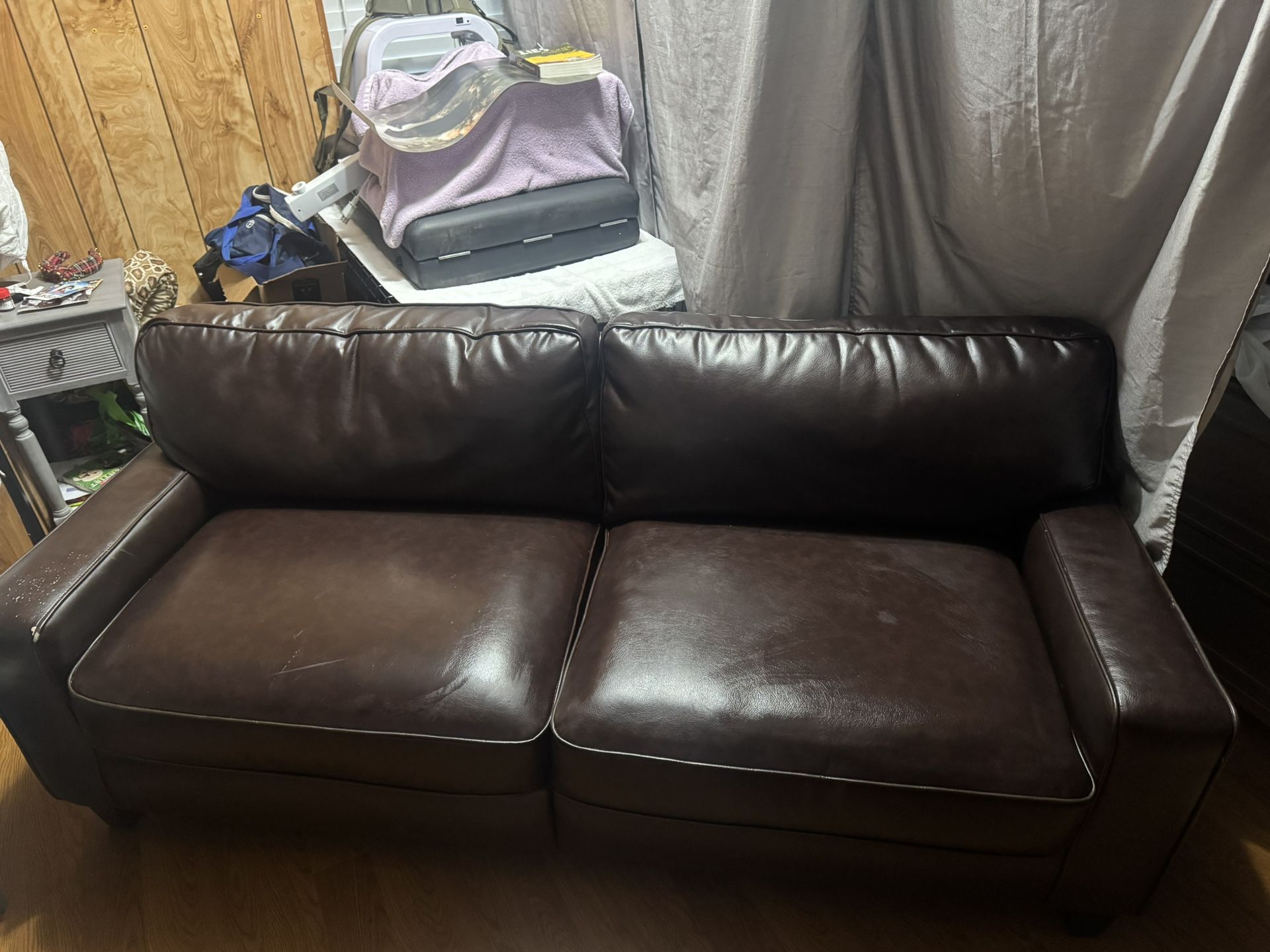 Brown pleather couch, some scratches on the right arm, and on the back. Other than that it’s a great couch and very comfortable.