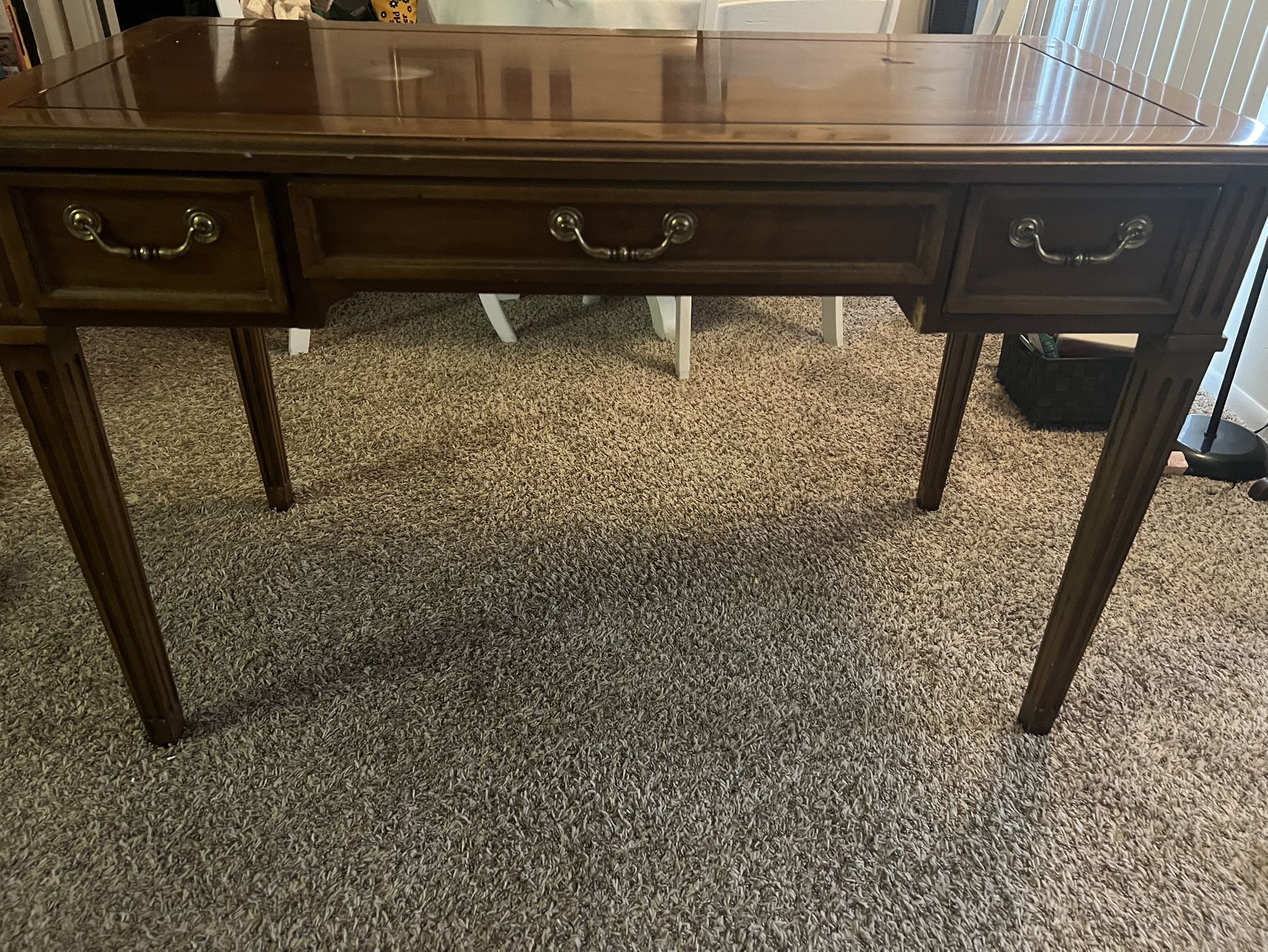 Real wood, dark brown desk with bronze colored knobs. A few scratches on the surface of the desk. The desk has 3 small drawers. Pretty desk but I no longer need it. Non smoking home. The desk is heavy. It will need two people to pick it up.