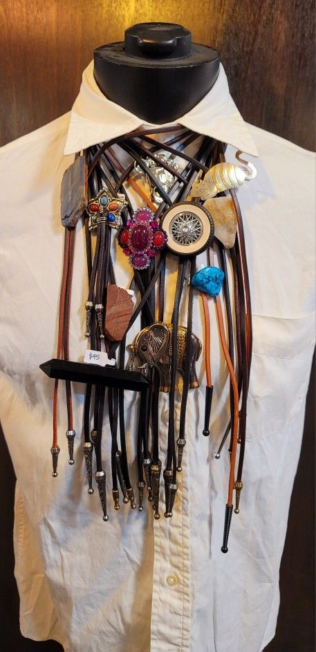 Handmade one-of-a-kind bolo ties. Some from vintage materials, some from stones, all with brand new leather. Most are $45 a small handful of them are $40 and a select few range from $55 to $100. Many available, and I'll be producing more as well. Due to the nature of upcycling vintage pieces into wearable jewelry each of these pieces are naturally unique and you won't be embarrassed by showing up to the party wearing the same bolo as everyone else. Feel free to message for specifics, pricing, sizing, and potential shipping!