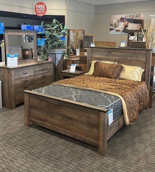 5 Pcs Rustic Brown Bedroom Set Queen/King Bed Dresser Nightstand Mirror Chest Trinell