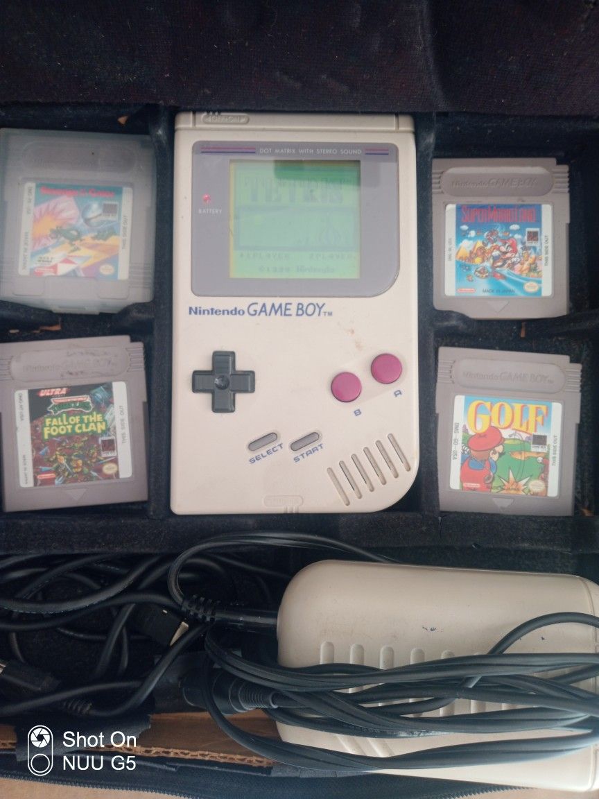 Original Nintendo Game Boy W Tetris +++ Extra games included Golf SuperMarioLand Ninja Turtles Footclan Revenge of Gator pinball Link cable and rechargeable battery w case