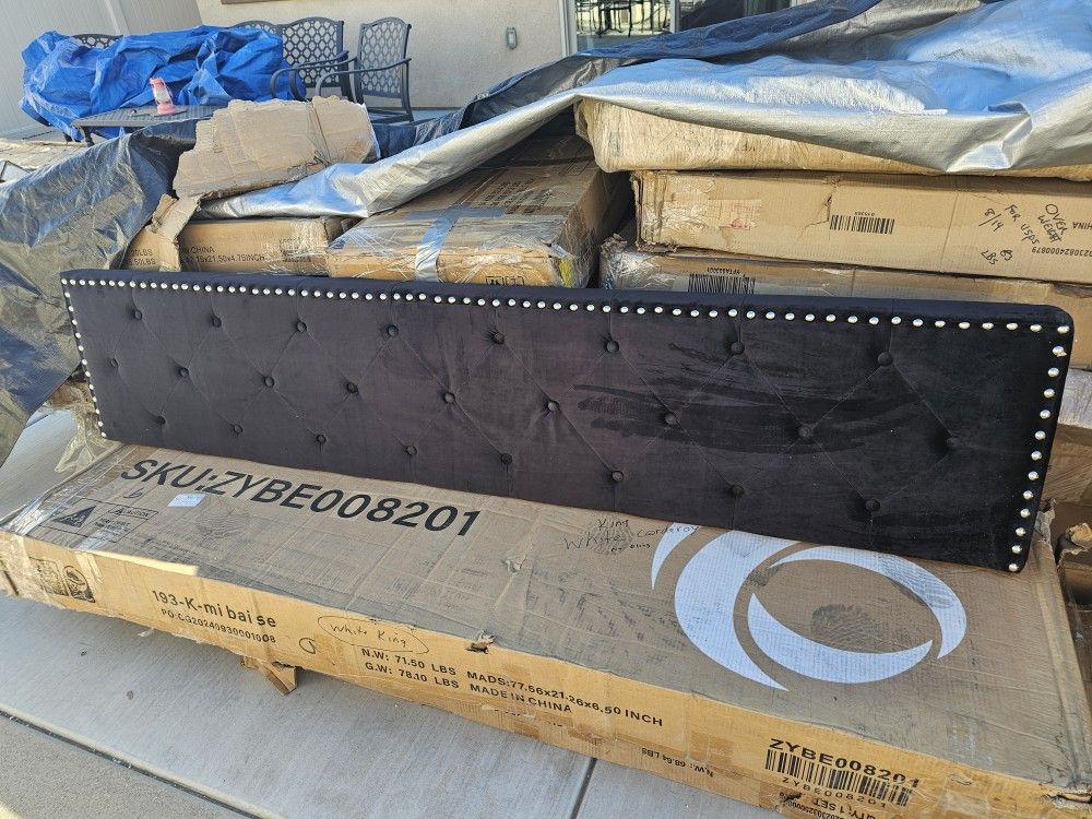 New, open box, king bed frame sets, black with chrome nailheads, black bling, dark gray material, white. Material, old-yellow bling, wood with black iron has led lights.