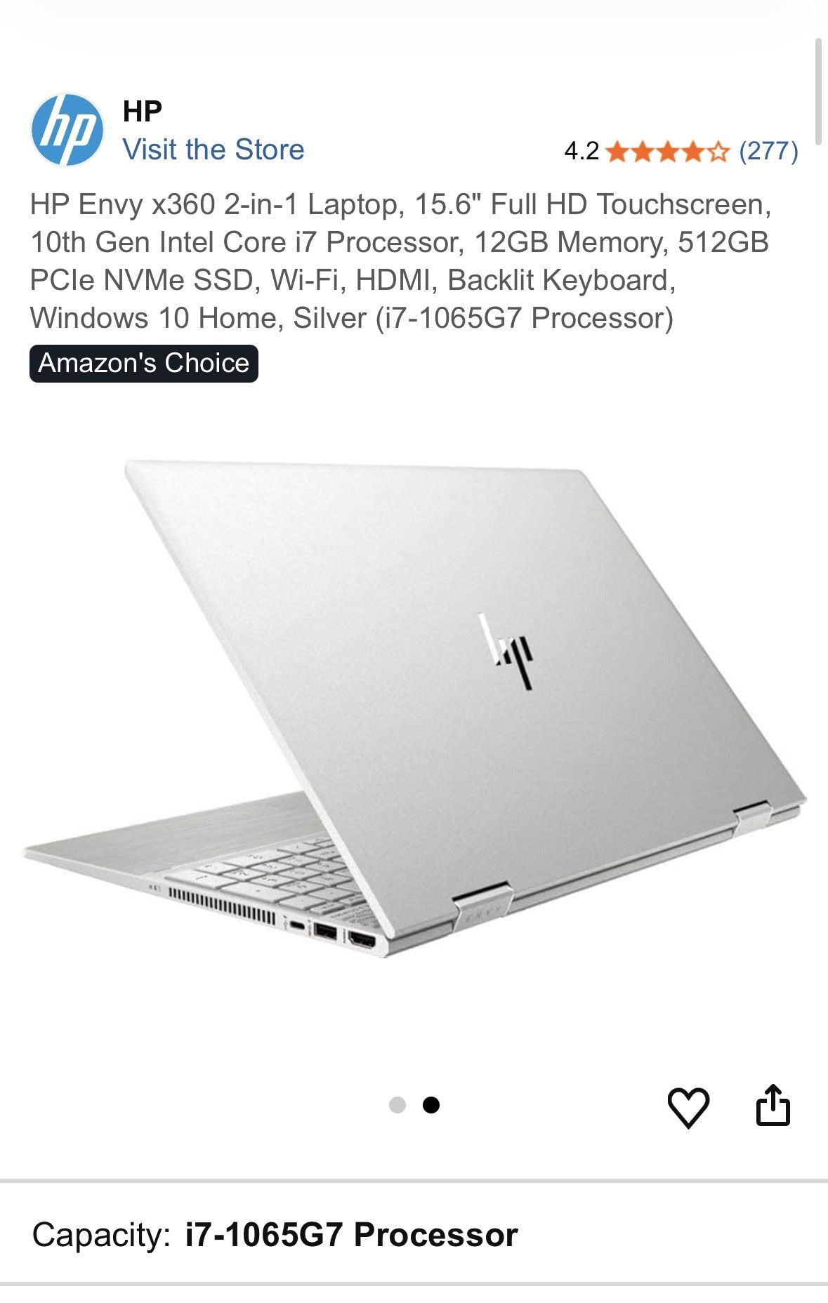 HP Envy x360 2-in-1 Laptop, 15.6" Full HD Touchscreen, 10th Gen Intel Core i7 Processor, 12GB Memory, 512GB PCIe NVMe SSD, Wi-Fi, HDMI, Backlit Keyboard, Windows 10 Home, Silver BARELY USED, very good condition no scratches or scrapes. Factory reset already. Charger included. HP
