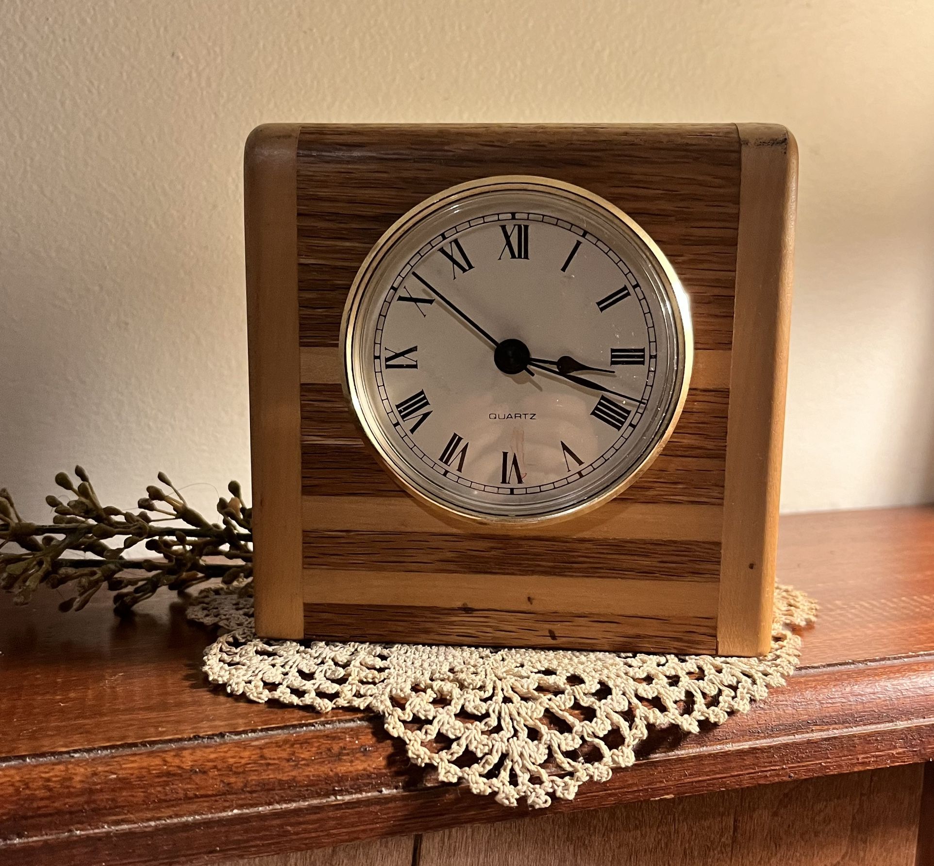 This is a rare piece, handcrafted wood clock. Perfect for desks mantles or any small spaces measures 4 1/2“ x 4 1/2“ would make a great little gift.