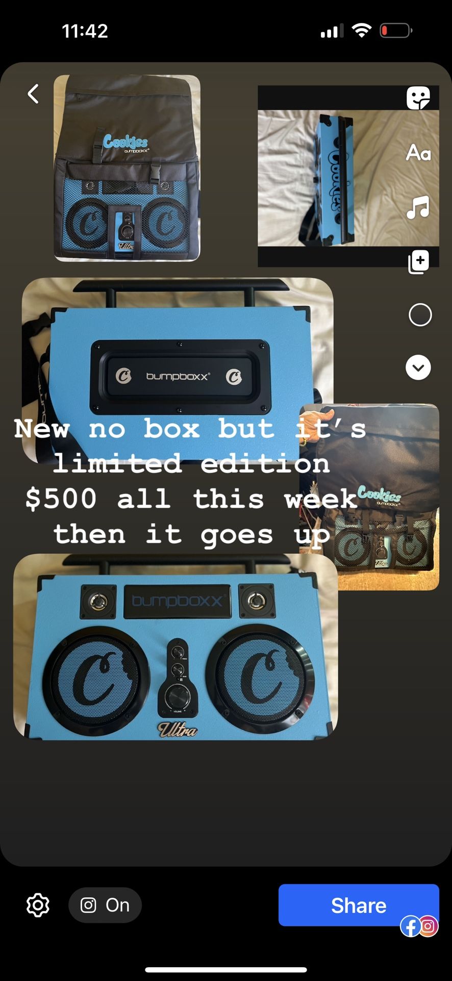 Limited addition cookie boombox comes with backpack brand new box got damage third away but it’s new never been used comes with charger smell proof backpack and a very beautiful speaker phone box inside of it a View one more pictures PM me only if you’re interested very firm on the price this is still $1000 anywhere else