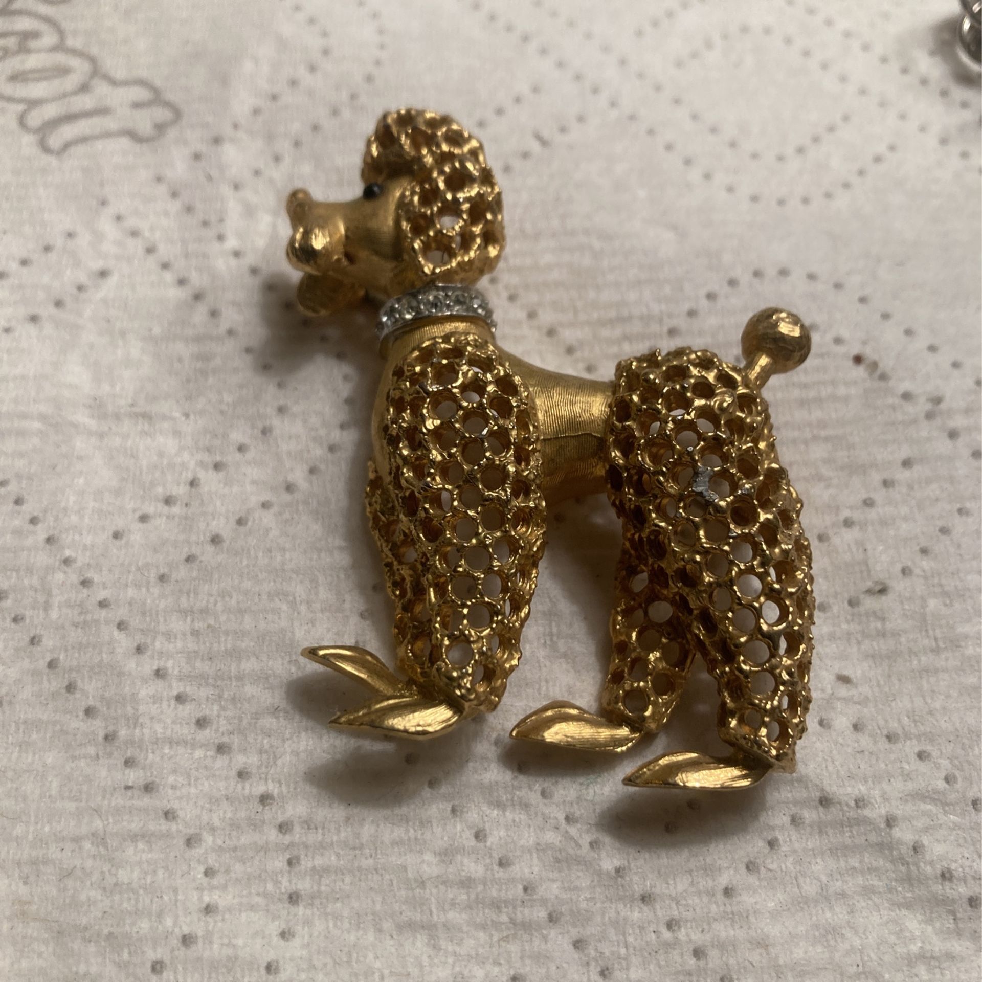 A gold tone poodle w/ a rhinestone collar perfectly groomed the legs ears & head have cutouts to illustrate longer hair signed1950s-early 60s lists for $55 collectible 1.5” x 2.25” adorable great gift