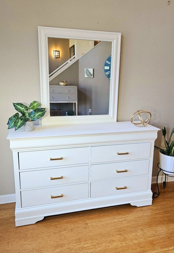Modern white dresser + mirror Color: off white + NEW gold handles. 6 drawers and all work great. Professionally painted and smooth to the touch. Piece is newly refinished, clean, sealed and free of any smell (smoke free home). You will receive a paint sample in case anything happens on the trip, you can retouch it. Pick up in the Valley (Thorn Freya exit) or we can deliver it for free within Spokane or for a small fee in other areas. Dimensions: 60L x 18W x 36H Mirror: 39H