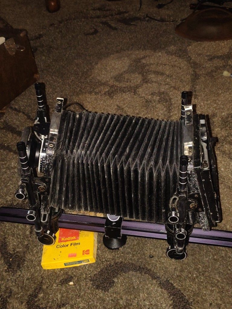 Have lots of extras with his camera film, and holders extra lenses bellows are not dry rotted and are and good condition has the leather case that it came in didn't want to put any chemicals on the bellows for cleanup