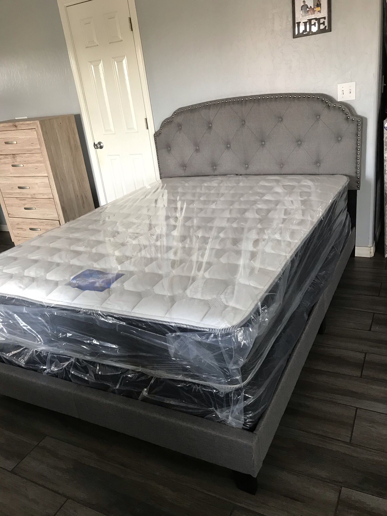 New queen size bed frame with mattress and box spring included. Delivery and setup available. Hablo Español
