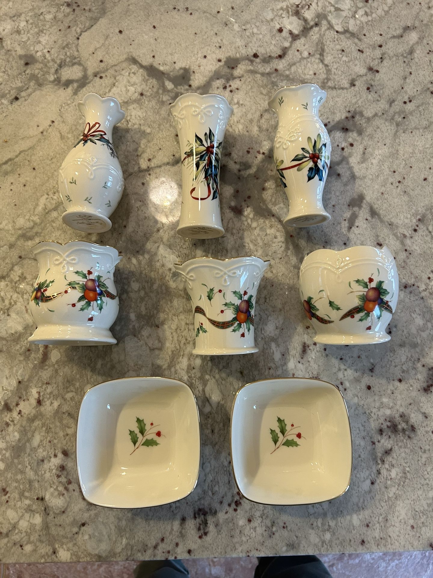 Beautiful collection of Lenox porcelain holiday pieces, perfect for Christmas decorating, gifting, or adding to your Lenox display. All pieces are in great condition with no chips or cracks. Gold trim intact. Included: 3 Lenox “Winter Greetings” bud vases (various shapes) 3 Lenox “Holiday” flared with holly & ribbon design 2 Lenox “Holiday” small square dishes (great for candy, nuts, or trinkets) All are marked Lenox / Made in USA on the bottom. Cash only Pick up in Lacey