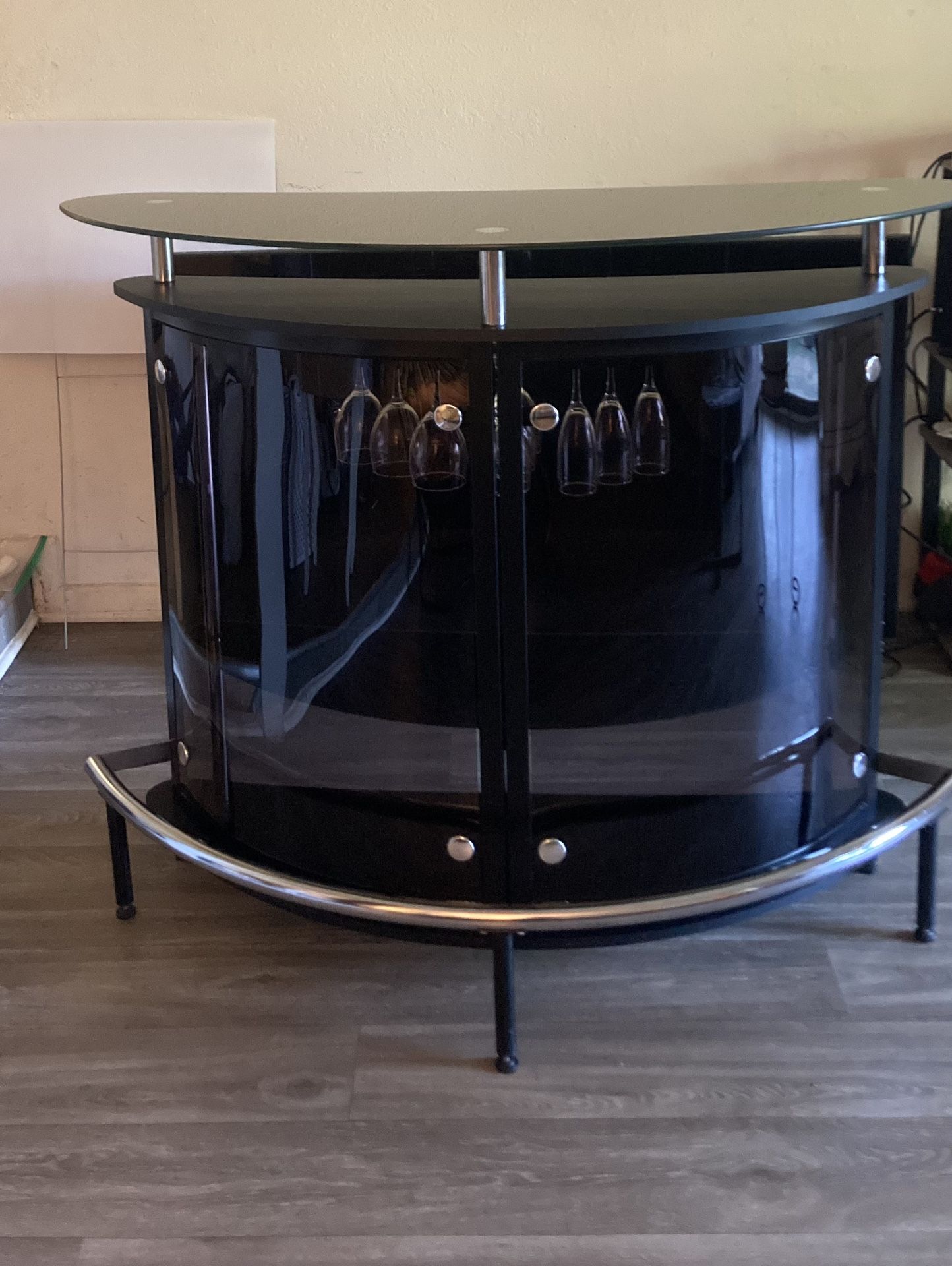 Curved black bar unit with glass top and built-in glass holders. Located in Lawrenceville for pick up.