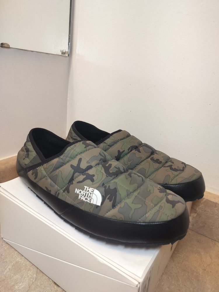 Super cozy and warm The North Face ThermoBall Traction Mules. Perfect for Denver winters, post-skiing, or just lounging around. Key Features: - Size: Men’s US 14 (Rare size!) - Color: Forest Floor Camo print - Insulation: Warm ThermoBall™ Eco insulation - Comfort: Soft faux fur lining for maximum warmth - Grip: High-traction rubber outsoles - Great for indoor/outdoor use, post-skiing, or camping. Condition: - Overall: Like new condition. - Usage: Worn only once - Soles: In brand new condition with zero signs of outdoor wear or scuffs. - Interior: Very clean, though the insoles show slight evidence of being worn a couple of times.
