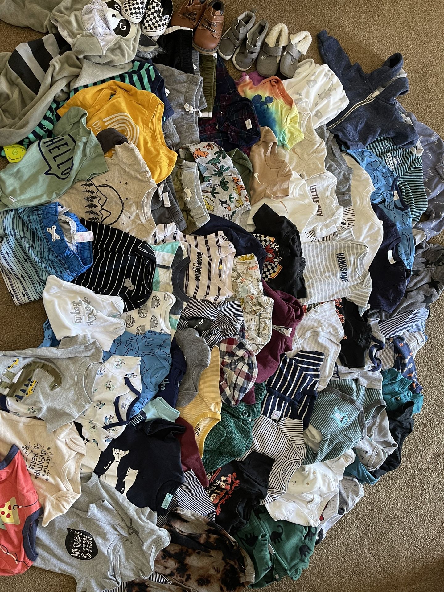 Assorted boys clothes sized from 3M-2T. Onesies, shirts, shorts, jackets, pajamas, shoes. Over 10lbs of clothes. Make me an offer.